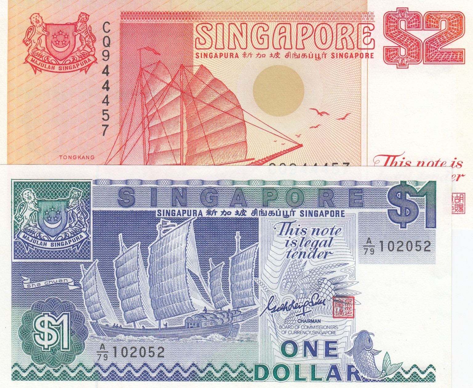 Singapore, 1 Dollar and 2 Dollars, 1987/1990, UNC, p18, p27, (Total 2 banknotes)br/serial numbers: A/79 102052 and CQ 944457