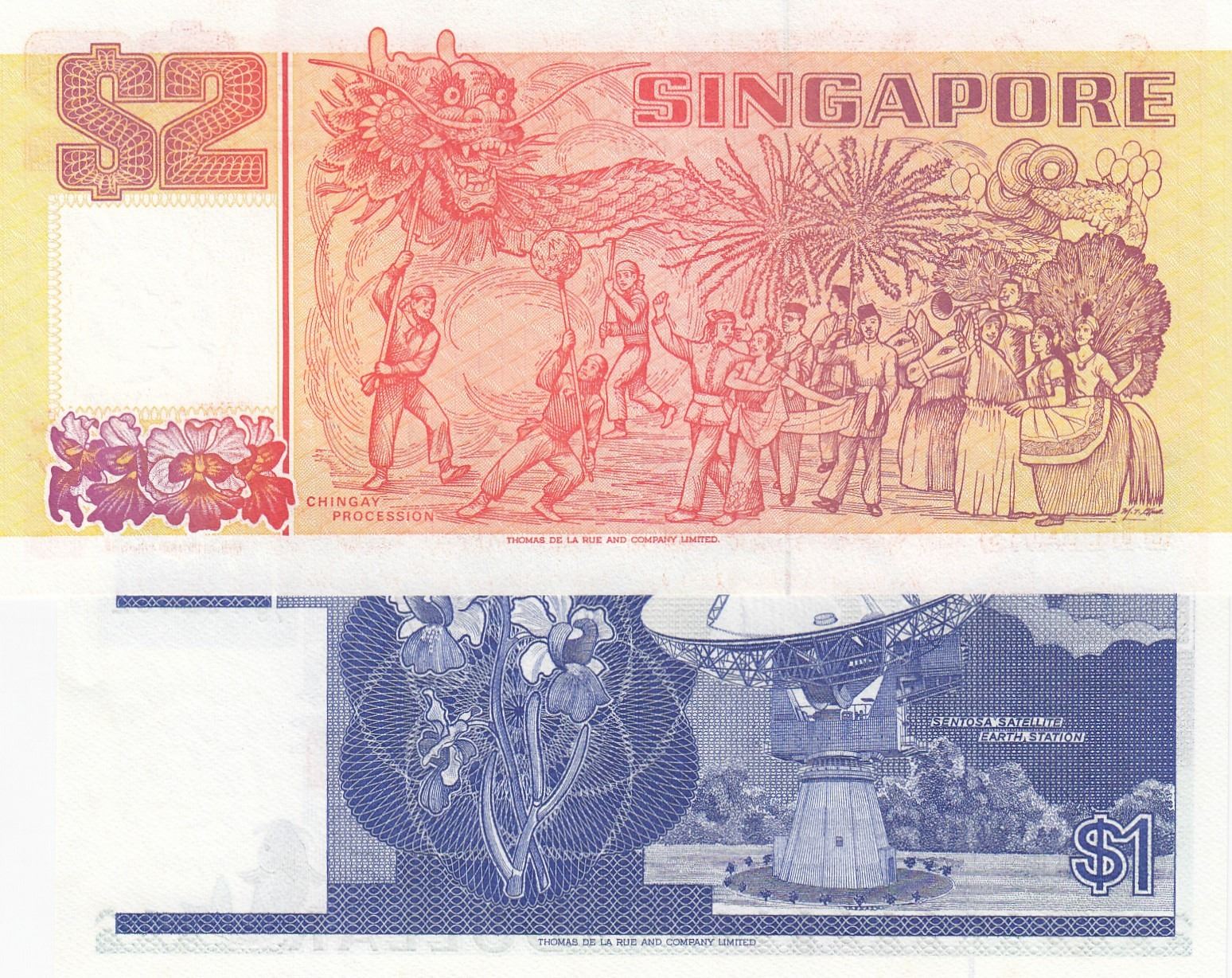 Singapore, 1 Dollar and 2 Dollars, 1987/1990, UNC, p18, p27, (Total 2 banknotes)br/serial numbers: A