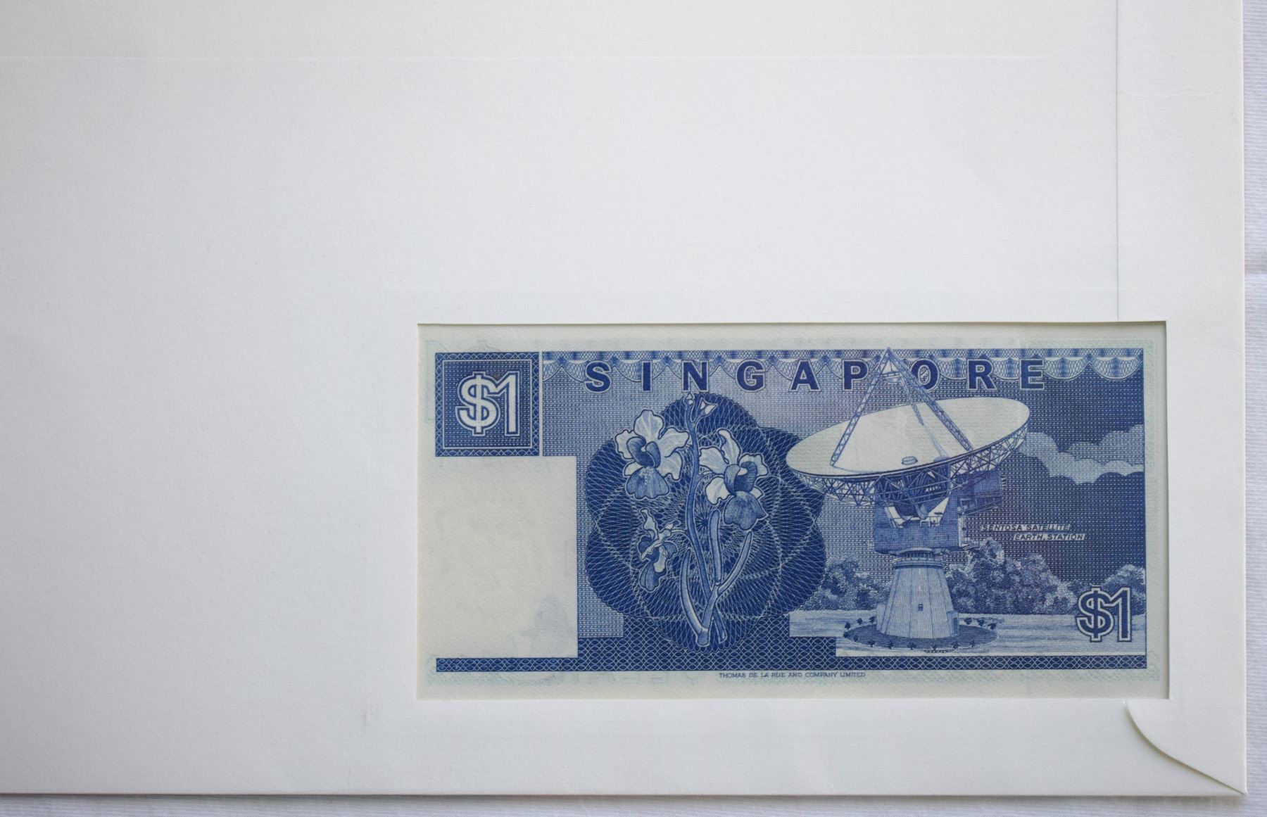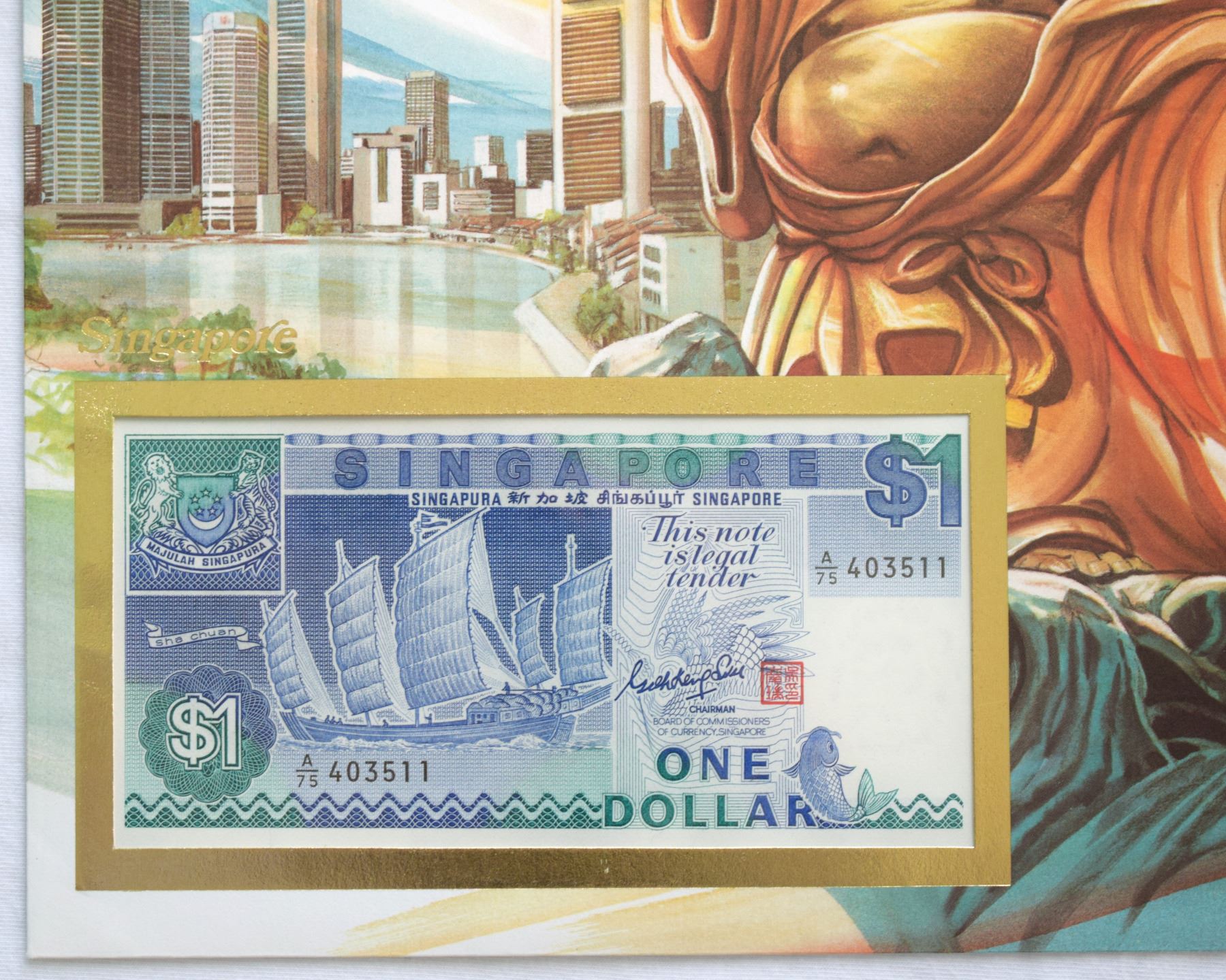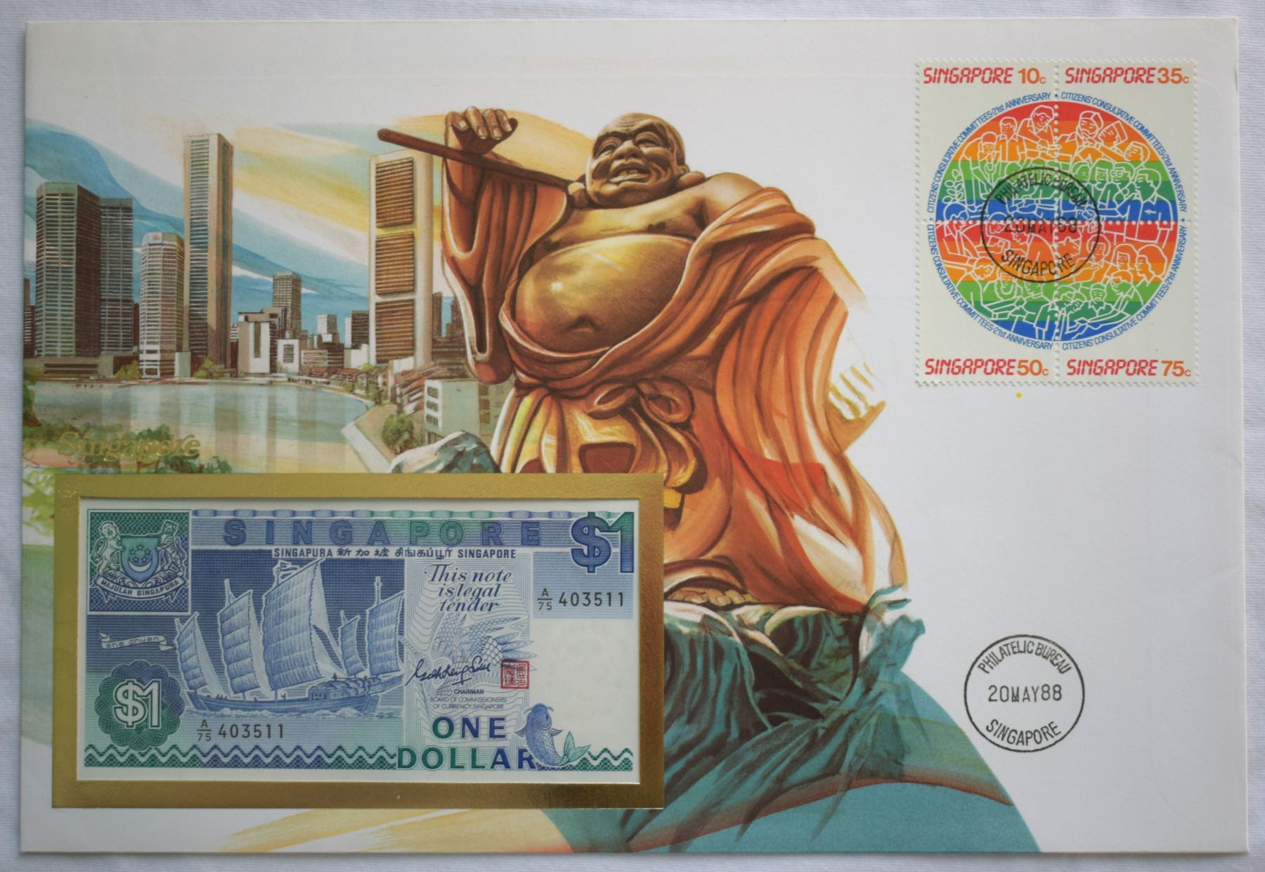Singapore, $1 ND (1987) First Day Cover Swiss Issued, Pick# 18a Vignette "Buda & City Shore" w/ Block of 4, Cancelled by Philatelic Boureau in 1988 Mint Cero Flaws.