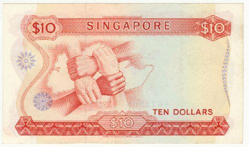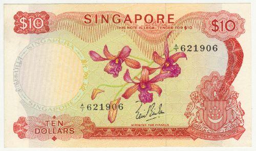 Singapore, 10 dollar issue 1967-73 ND UNC Pick number 3a serial A/7 621906. Beautiful orchids on front.