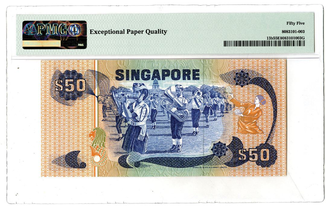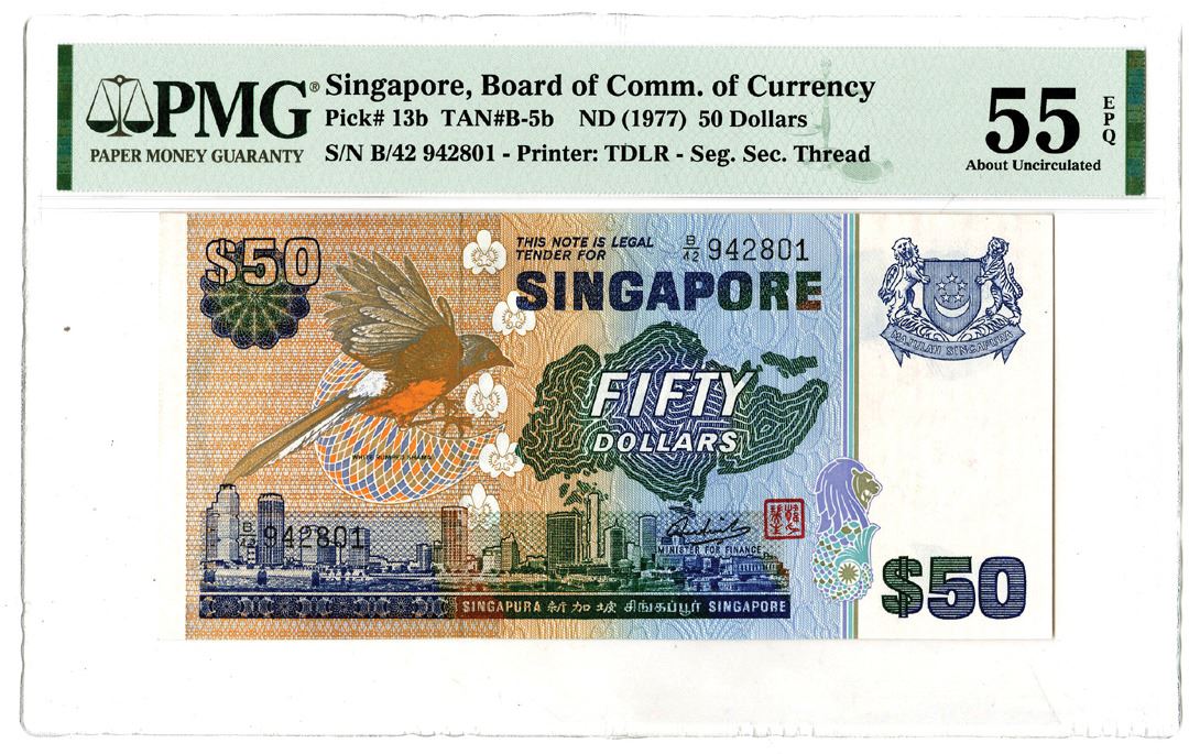 Singapore. ND (1977). 50 Dollars, P-13b, Issued banknote, Orange and blue on face, S/N B/42 942801, Seg. Sec. Thread, PMG graded About Uncirculated 55 EPQ. Printer: TDLR.