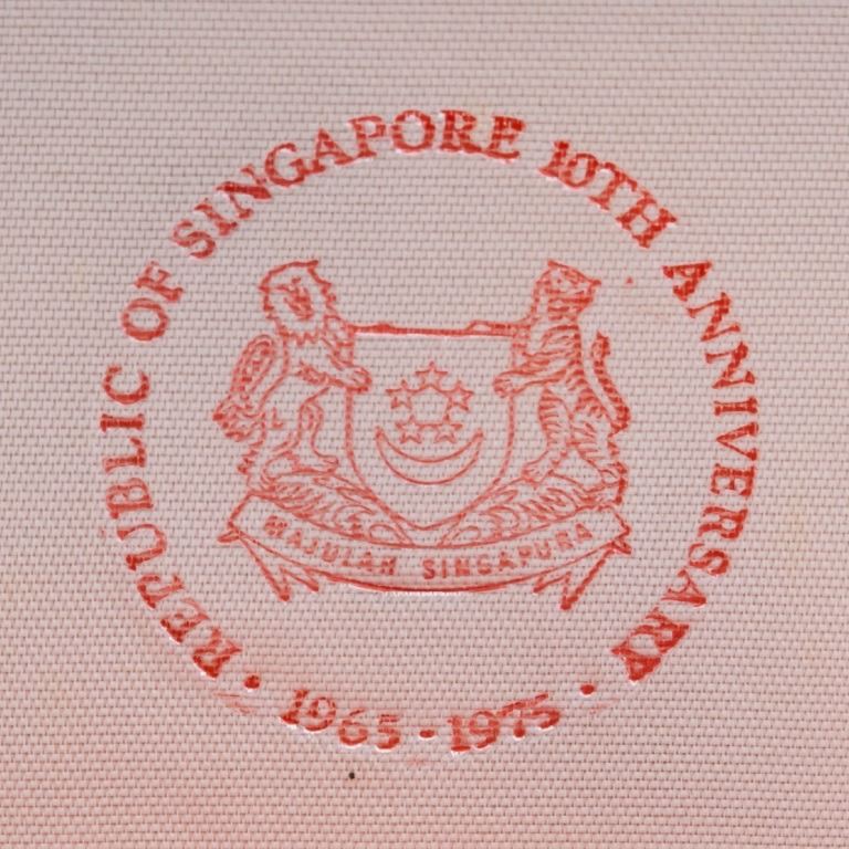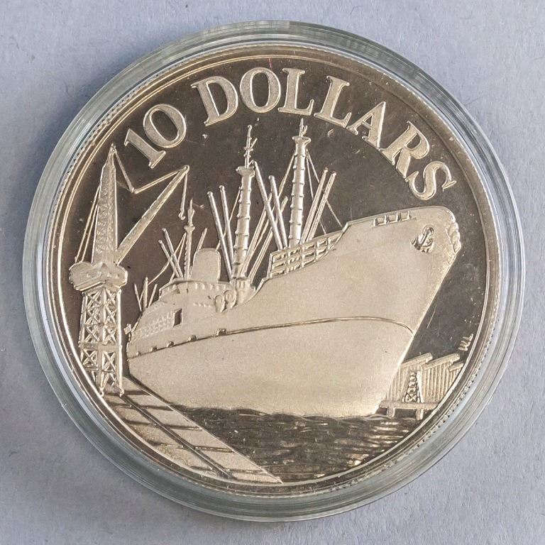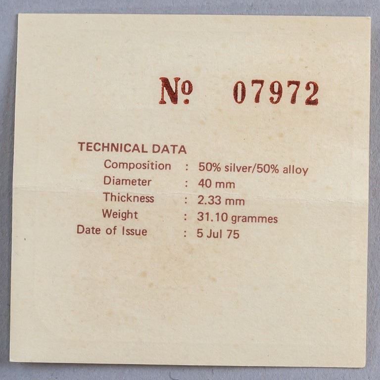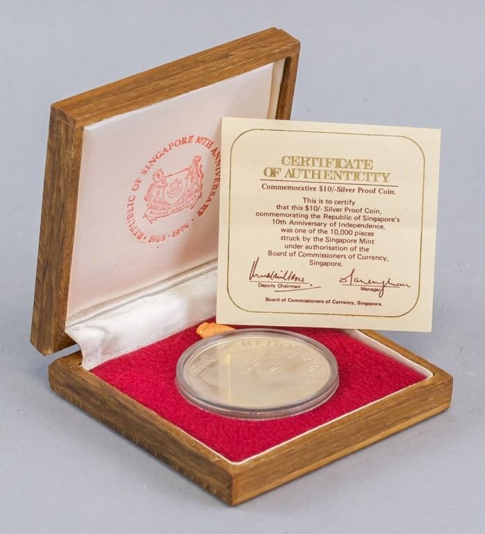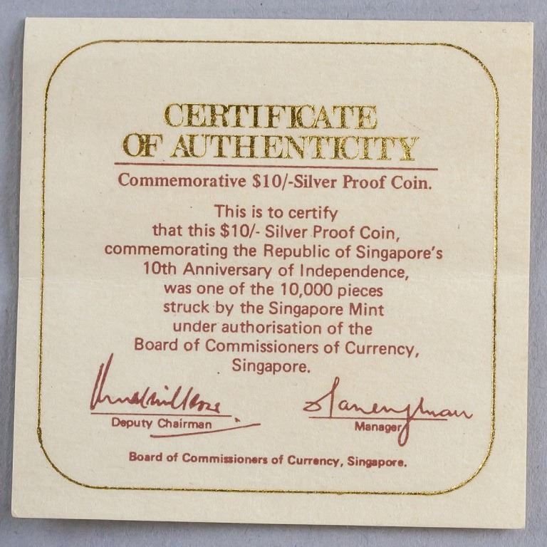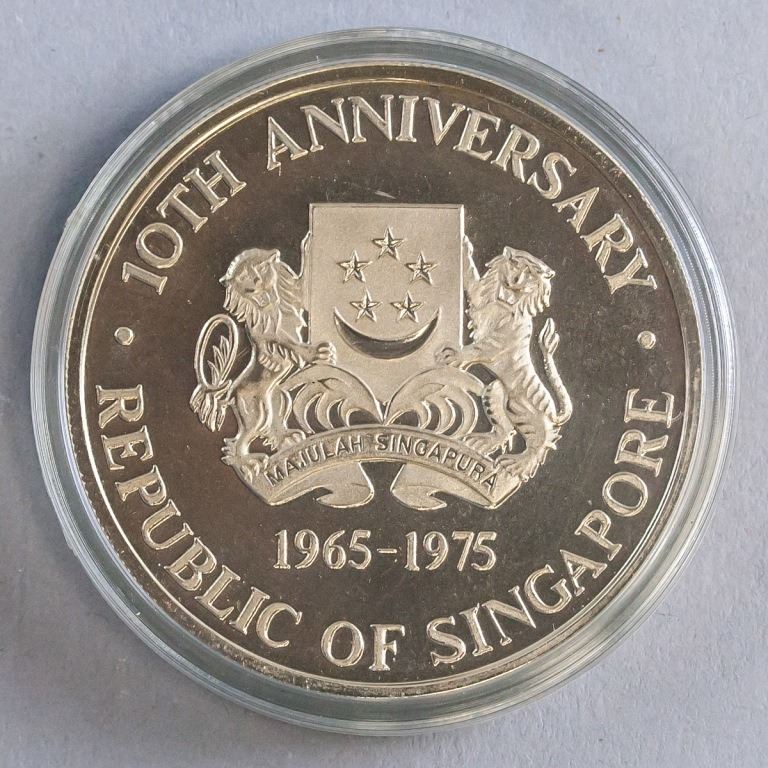 Singporean coin. Commemorating the 10th Anniversary of Independence. Obverse: The Singapore Coat of Arms with supporters in the centre surrounded by the word "SINGAPORE" in the four official languages. Date below the Coat of Arms. Lettering: SINGAPURA / [TAMIL] / MAJULAH SINGAPURA / XIN JIA PO / SINGAPORE / 1976. Reverse: A freighter berthed alongside a wharf, with the denomination above and the designer's initials to the right of the ship. WL lettering on the right indicating designer's name, William Lee. Lettering: 10 DOLLARS / WL. Accompanied with COA. Diameter: 4 cm. 39 grams (with case).