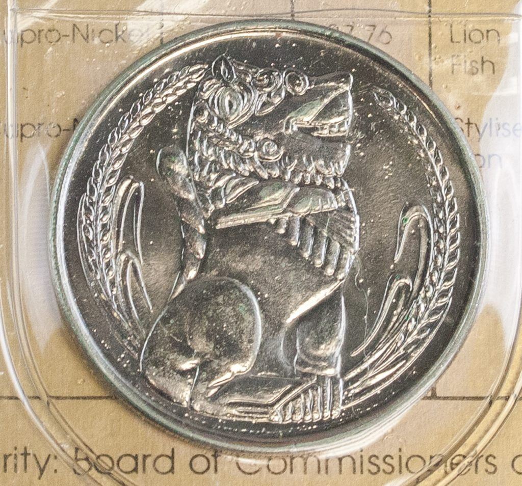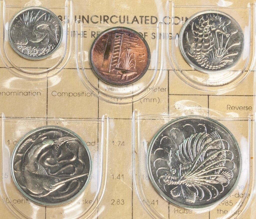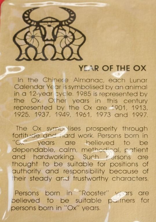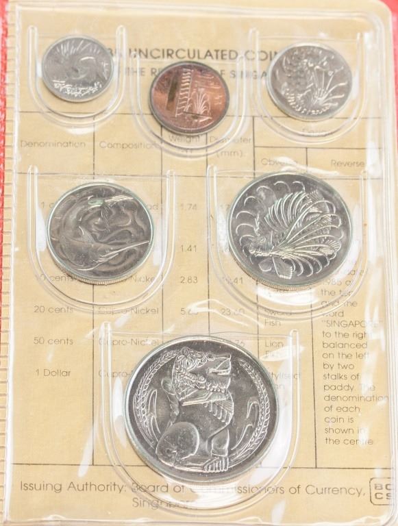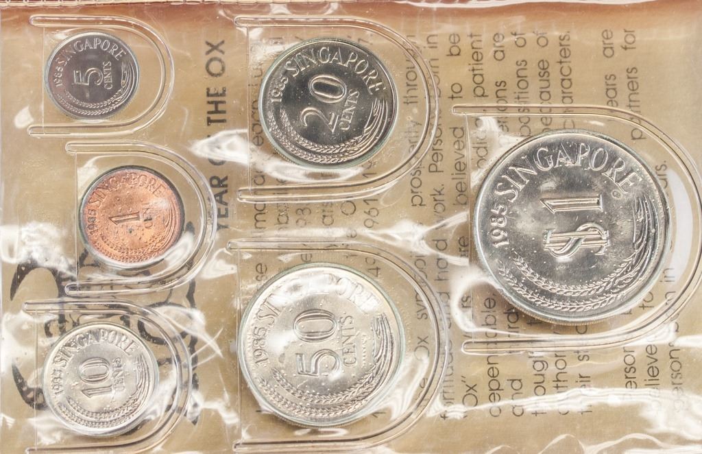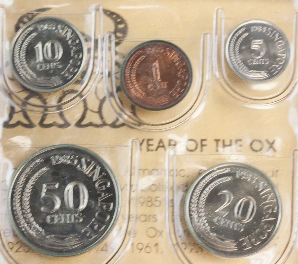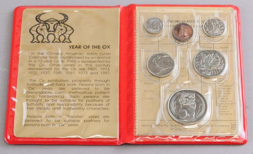 Singapore coin set. Issued in 1985, commemorating the year of the Ox. Featuring six coins of different denominations. Uncirculated coins. 15 x 10 cm. 114 grams.