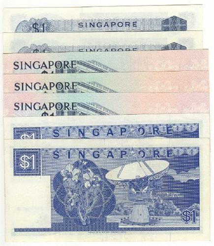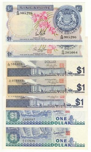 Singapore, 1 dollar issue 1967-73 ND UNC Pick number 1c serial A/39 905286, 1 dollar issue 1967-73 ND UNC Pick number 1d serial D/49 205064, 3 x 1 dollar issue 1976-80 ND 2 EF & 1 UNC Pick number 9 serial A/28 566406, A/63 876448, G/4 324458, 2 x 1 dollar
