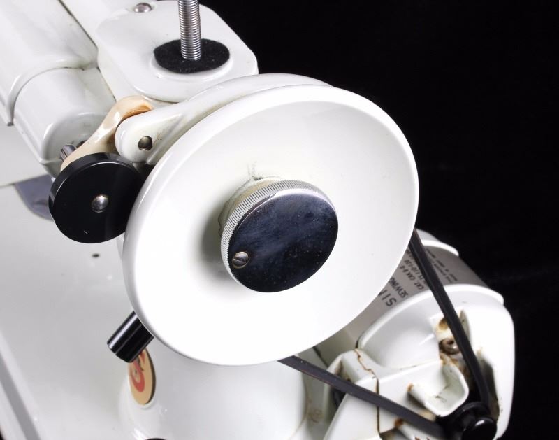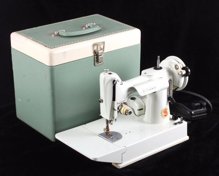 This is a Singer Featherweight sewing machine. The sewing machine is a model 221 and is the more scarce white color. Included with the sewing machine is the original box, foot pedal, manual and box with attachments. The Singer Featherweight sewing machine is in good condition. The box measures 8.5" x 12.5" and is 11" tall.