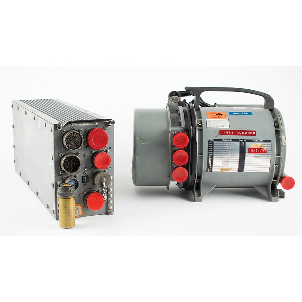 Navigational computer system hardware built by the Kearfott Division of the Singer Company in Little Falls, New Jersey, including: a CP-924/ASN-84 navigational computer, measuring 18.5è x 7.75è x 5è, with an identification plate on top, "CP-924/ASN-84, Ser. CSG 0057, N00383-68-A-301, C70491505, Mfr 88818," and a Singer Kearfott overhaul tag dated February 1976 on the rear; and a CN-1231/ASN-84 gyroscope assembly, measuring 14è x 10è x 9è, labeled on the top, "CN-1231/ASN-84, Ser. CSG082, N00383-68-A-3201, C702732024-1, Mfr 14804." Affixed to the body of the gyroscope assembly is a listing of codes and constants, as well as a Singer Kearfott overhaul tag dated August 11, 1983. This type of computer/gyroscope system saw application on several military aircraft‰ÛÓincluding the LTV A-7D/E Corsair II, Republic F-105 Thunderchief, and Lockheed P-3B/C Orion‰ÛÓas well as the AGM-69 SRAM nuclear missile. In fine condition. This item is ITAR restricted; no export or sale to non-US citizens.