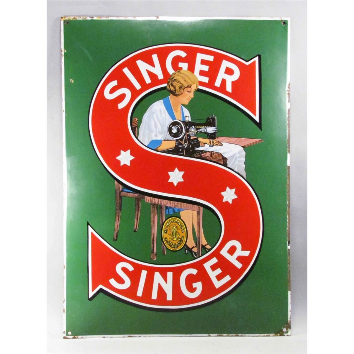 Singer Sewing Convex Porcelain Sign. Some chips around perimeter otherwise good condition. 19 1/2 X 27 1/2 inches. Start Price $300