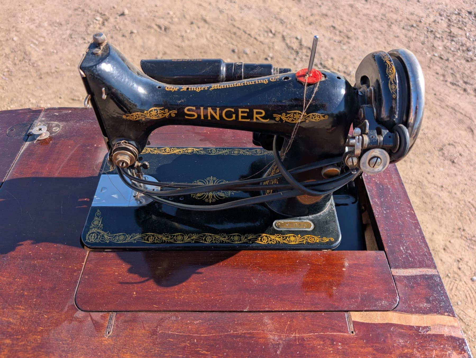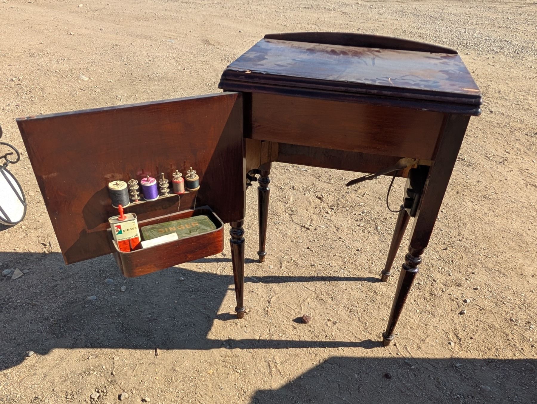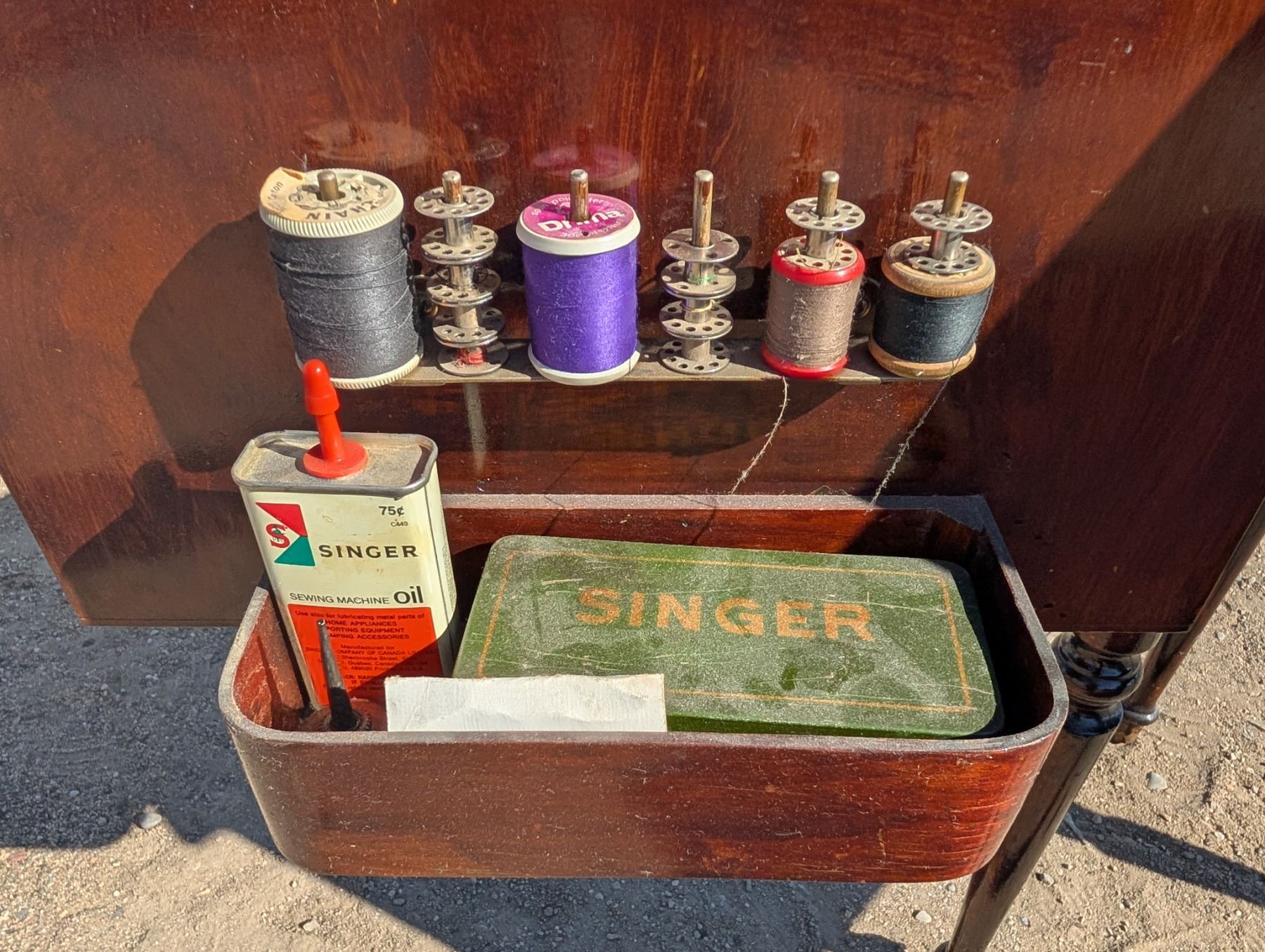 Singer Sewing Machine ED771569 SER.NO 6080427 Table w/ Misc. Sewing Items (Not Tested)