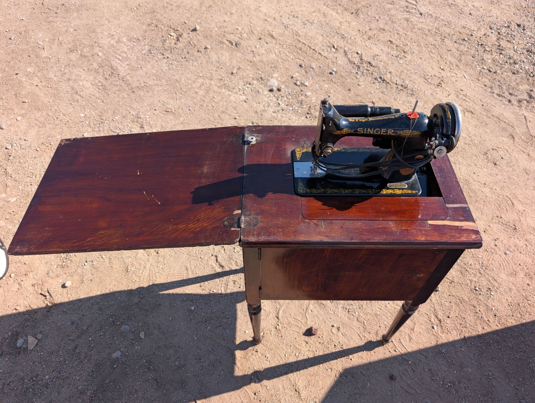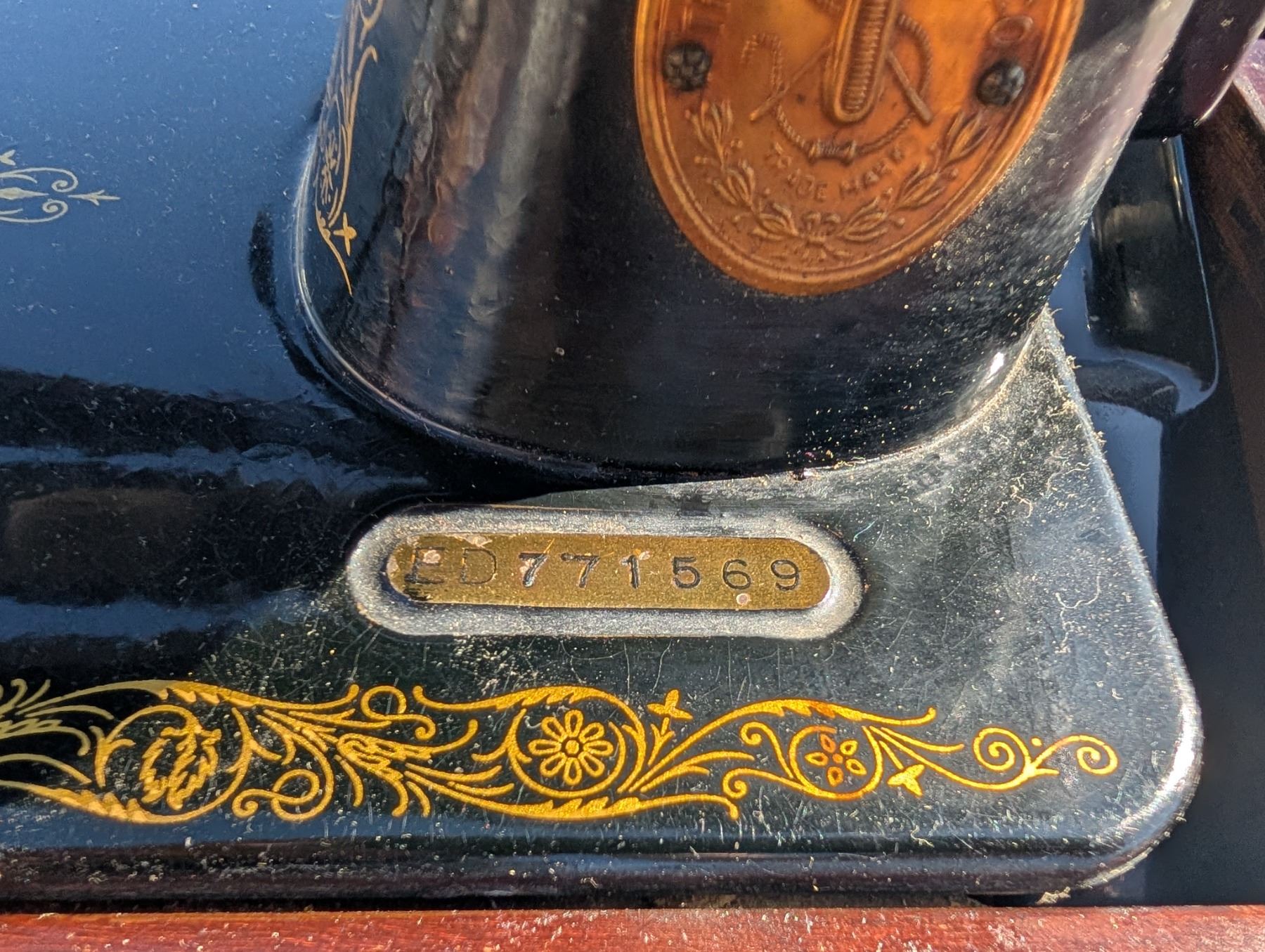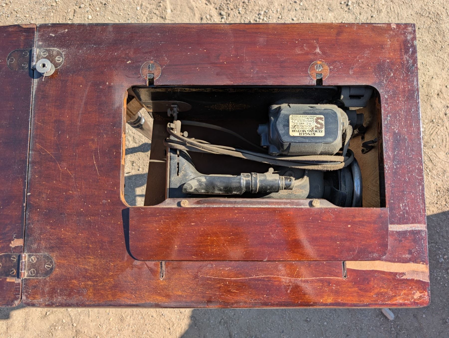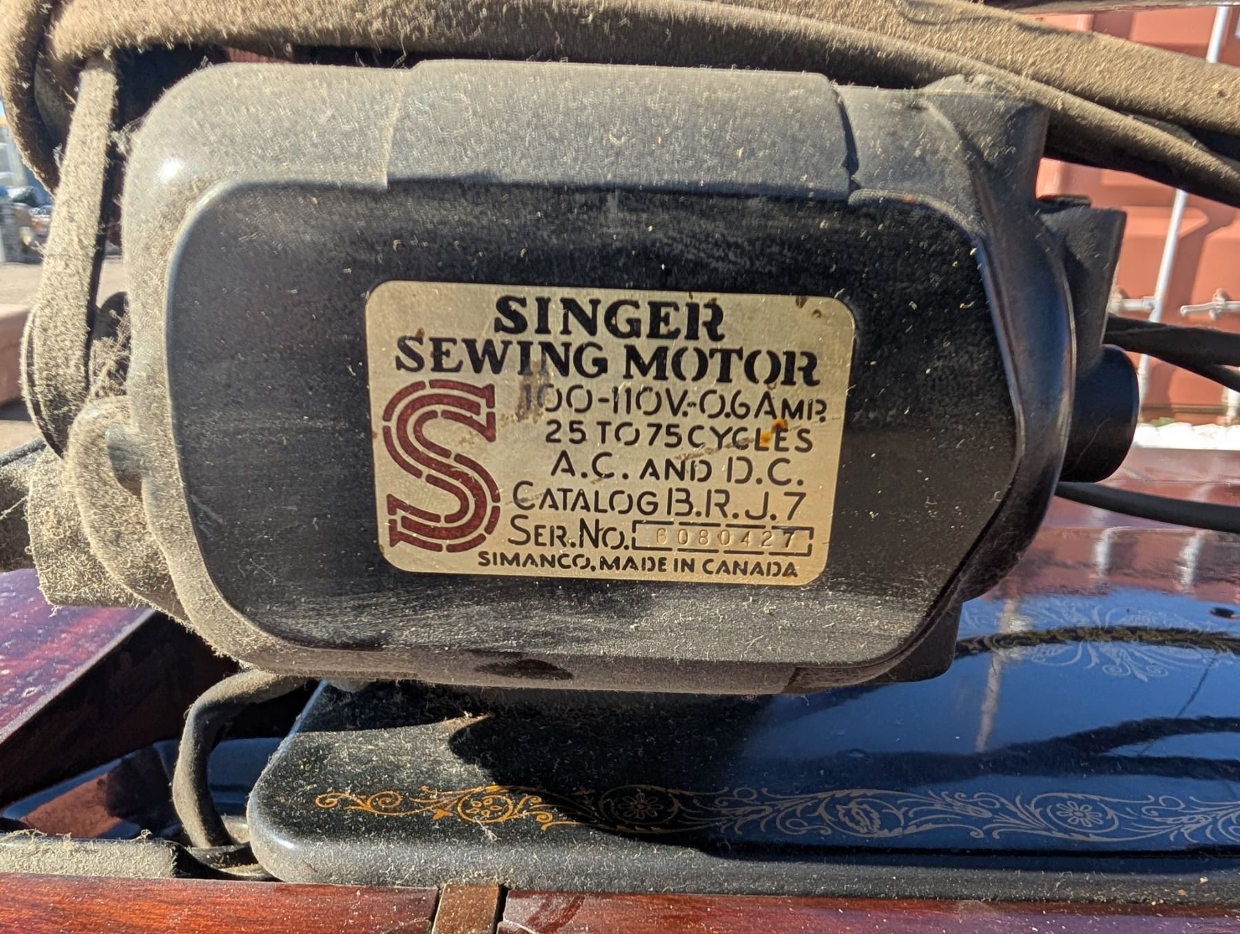 Singer Sewing Machine ED771569 SER.NO 6080427 Table w/ Misc. Sewing Items (Not Tested)