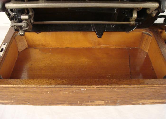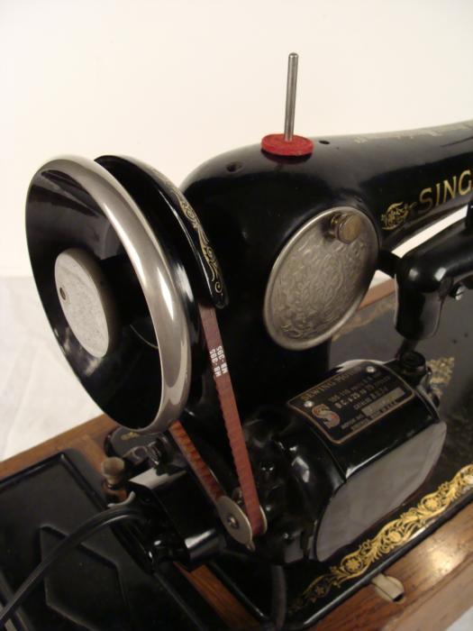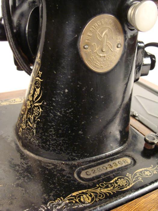 This is a vintage Singer electric powered sewing machine, in the original wooden case with lid. The serial number, C2603368, indicates that it was made sometime after 1908 in Wittenberge, (Prussia) Germany. It is in good condition overall, and seems to working fine, with a new belt. The body of the machine has overall light wear, but the surface is generally good, and free of bad scratches. The gold tone ornamentation and lettering is about 75% good, with normal wear that mostly on the flat surface. The embossed logo emblem on front is very good. The motor serial number is 5913512. The bottom wooden portion of the base has cracks, but the base itself is still plenty sturdy. The wooden lid has some light wear, light scratches, and a tape mark that could probably be cleaned up. The Singer name in gold lettering is crisp and clean. The lock for the lid is working fine, and the key is included.