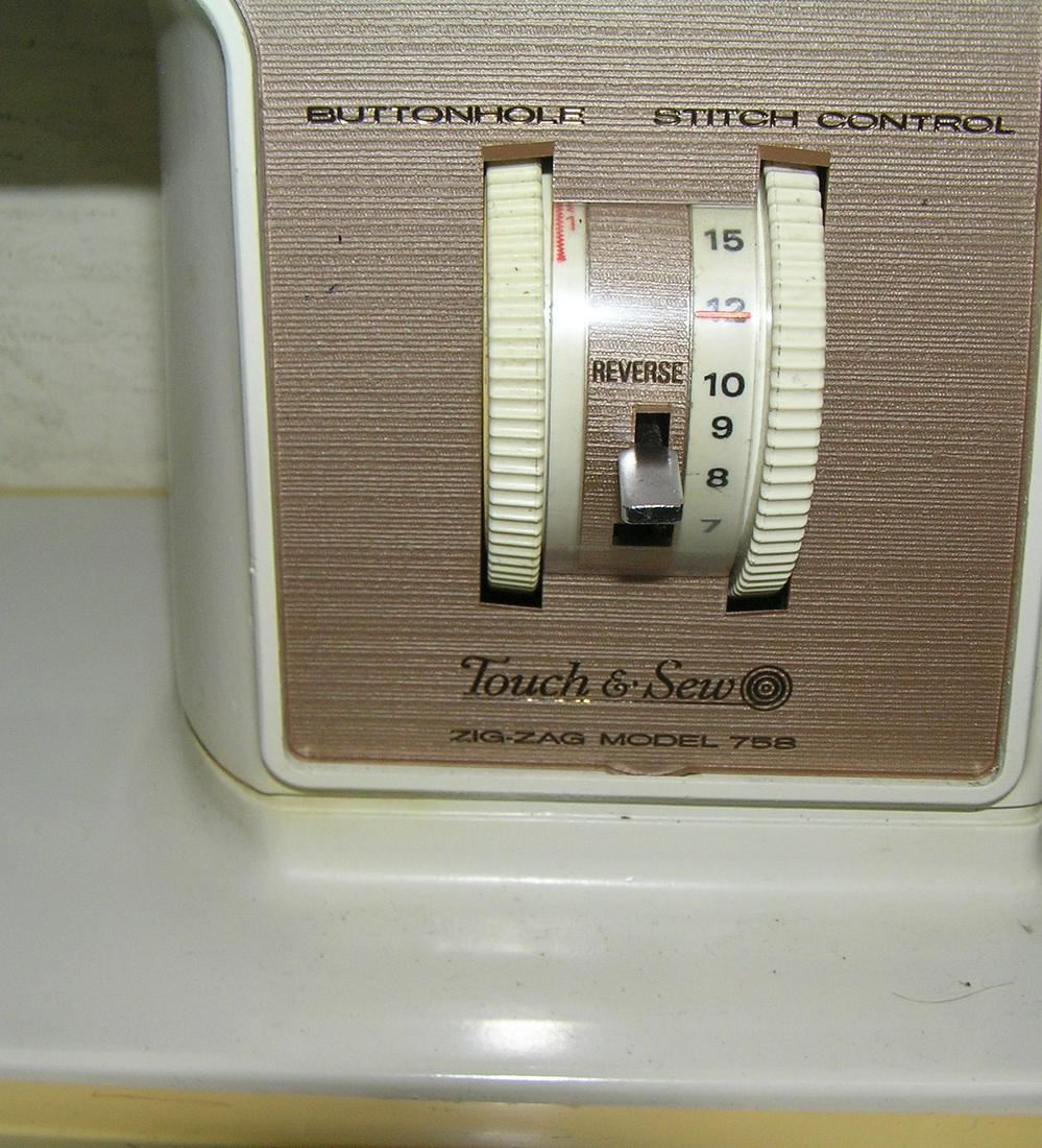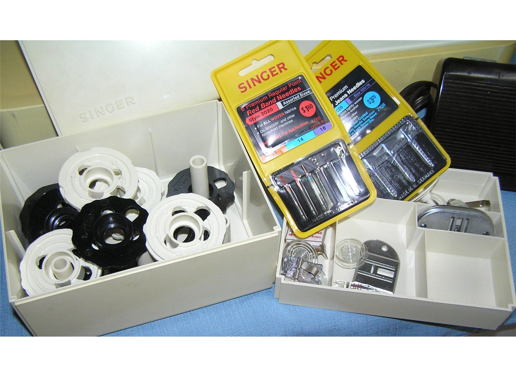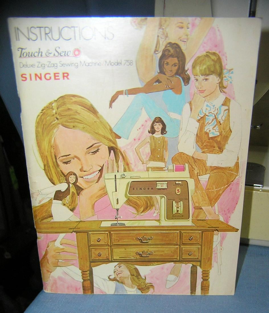 Vintage Singer touch and sew deluxe zig zag sewing machine model number 758 complete with all attatchments, foot pedal, instruction booklet and carrying case est. value $200.00-$215.00