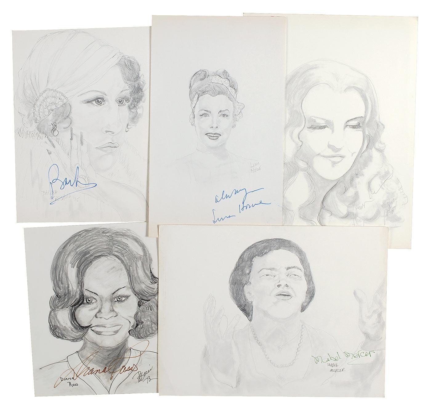 Five original pencil sketches done by a collector, ranging in size from 7.5 x 9 to 9 x 12, each signed in ink or pencil by the respective celebrity pictured. Signers are: Barbra Streisand (first name only), Mabel Mercer, Lena Horne, Peggy Lee, and Diana Ross. In fine condition, with edge toning to a few of the sketches.