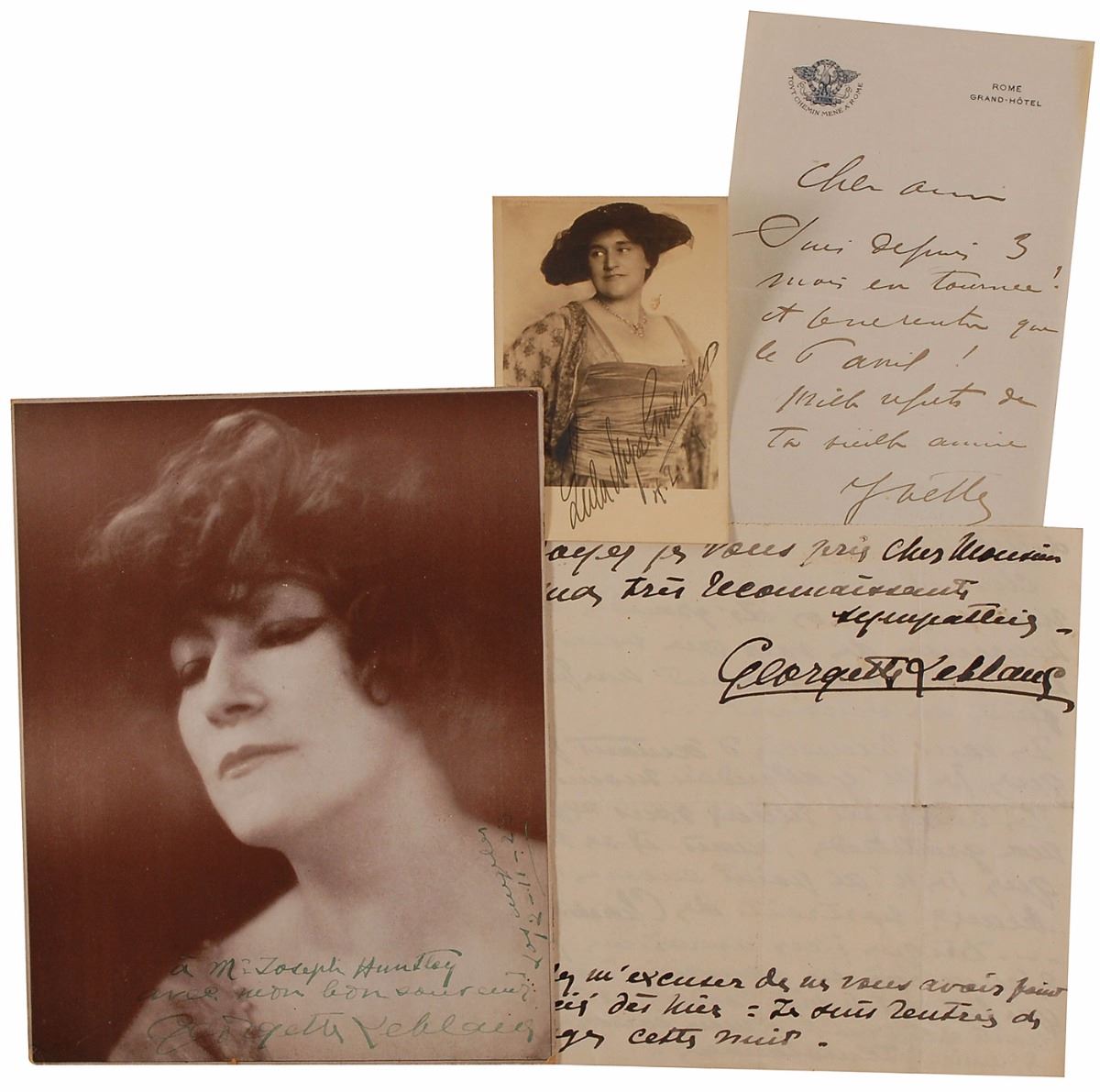 Four items: a vintage 8 x 10 head-and-shoulders photo of Georgette Leblanc, signed and inscribed in green fountain pen; an untranslated ALS,one page, both sides, no date, regarding photographs of her in the role of Charlotte Corday; a one-page ALS from Yvette Guilbert, signed first name only; and a 1924 ALS, in German, from Lula Gmeiner on a postcard.