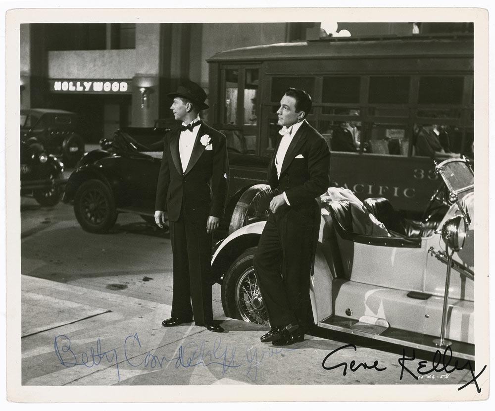 Vintage pearl-finish 10 x 8 MGM publicity photo for Singin’ in the Rain, signed later in black felt tip by Gene Kelly and in blue ballpoint by writers Betty Comden and Adolph Green. Some light edge creases and corner dings, and Green’s signature light, but legible, otherwise fine condition. Pre-certified PSA/DNA and RRAuction COA.