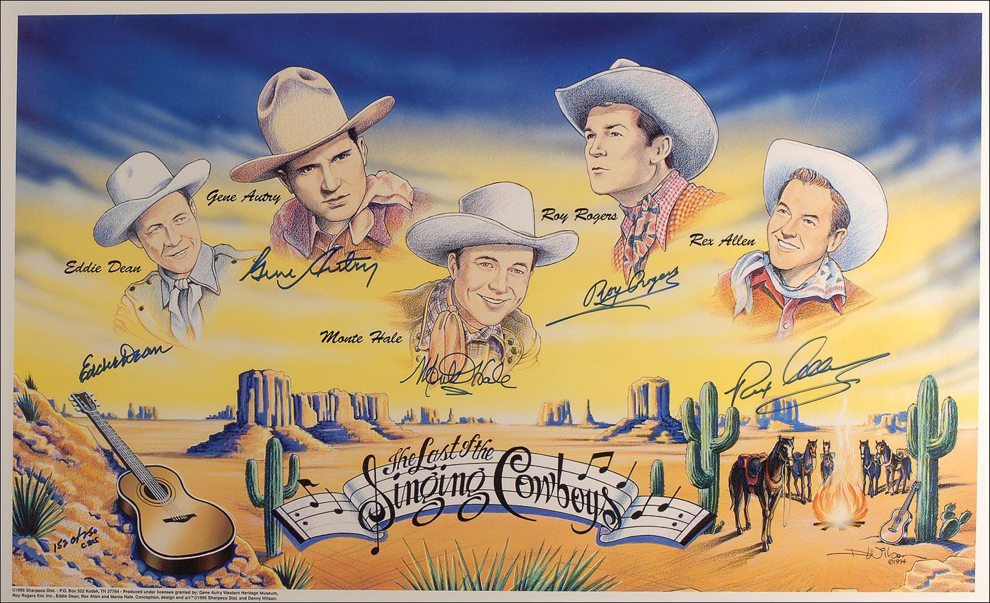 Color limited edition 29 x 17 print entitled ‘The Last of the Singing Cowboys,” numbered #152/250,’ signed in blue felt tip by all five pictured: Gene Autry, Roy Rogers, Eddie Dean, Monte Hale, and Rex Allen. Rolled and in fine condition.