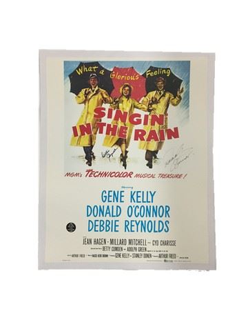 Singing in the Rain (Metro-Goldwyn-Mayer, 1952) Half Sheet. Starring: Gene Kelly, Donald O' Connor, and Debbie Reynolds. Autographed by Debbie Reynolds and Donald O' Connor. Near Mint. (29.75" X 32.75"). Cotton canvas linen-backing. Paired with a piece of the original, wooden dance floor from Debbie Reynolds Dance Studio, with a custom engraved "Debbie Reynolds Dance Studio" plate (3.5"x 6.25"). This amazing memorabilia comes direct from the Debbie Reynold's archive collection.
