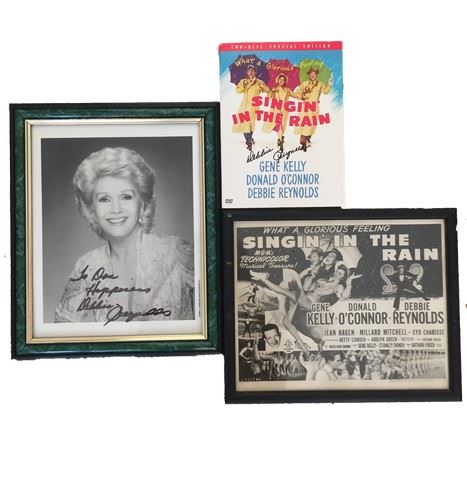 Collection of Debbie Reynolds "Singing in the Rain" signed two disc special edition and black and white mini poster (numbered 52/140) framed (8 1/2" x10"). Also included is a signed autograph of Debbie Reynolds that says "To Don, Happiness Debbie Reynolds" (10"x11").