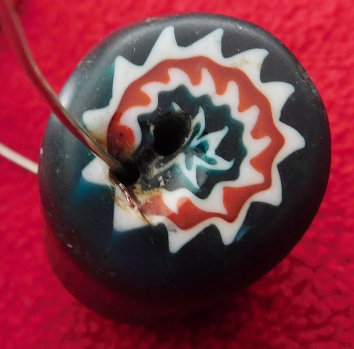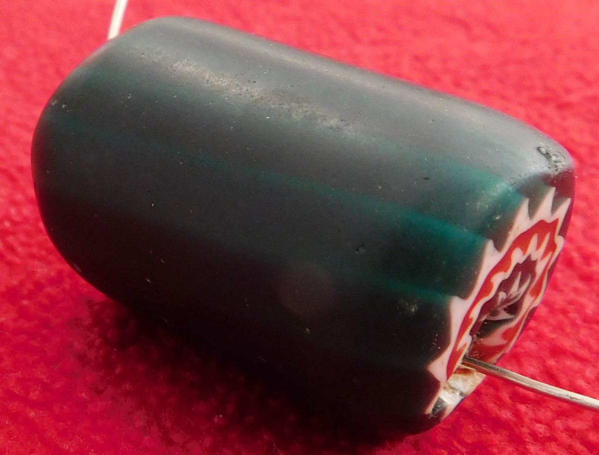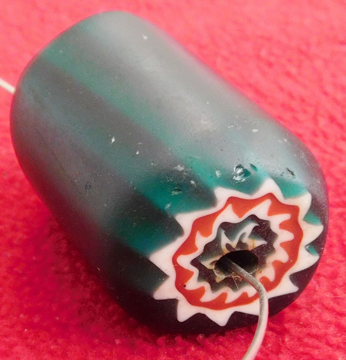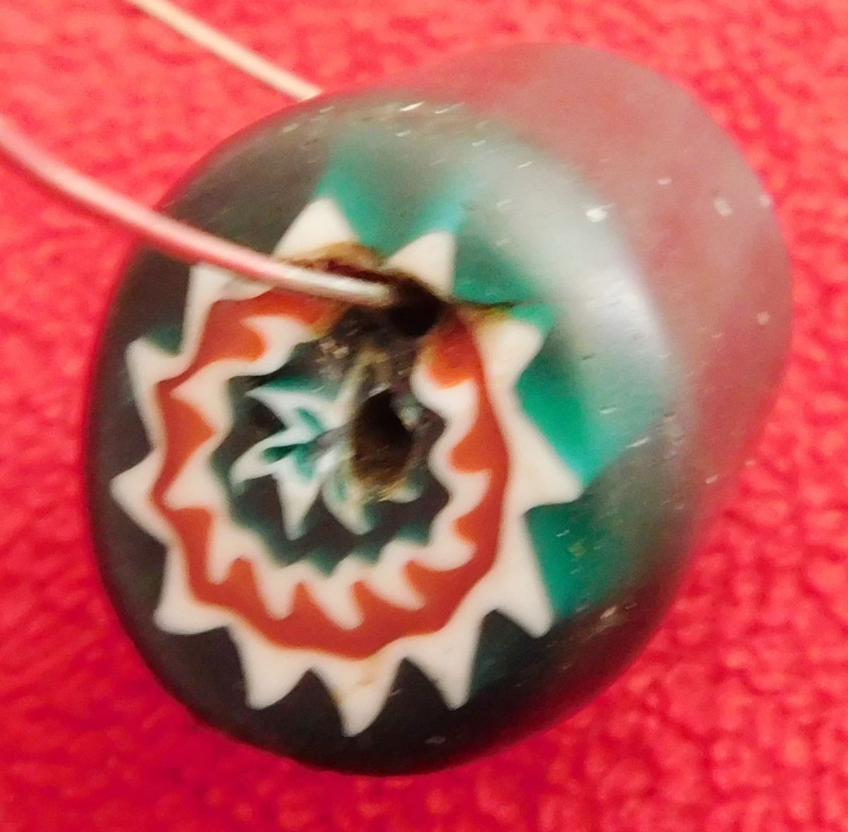Single 6-Layer Chevron Bead, circa 1700s. Made of glass, this green, red and white star bead measures 2" x 1". From Italy. Condition: Good, see images. Shipping: $16.00 w/insurance and signature.