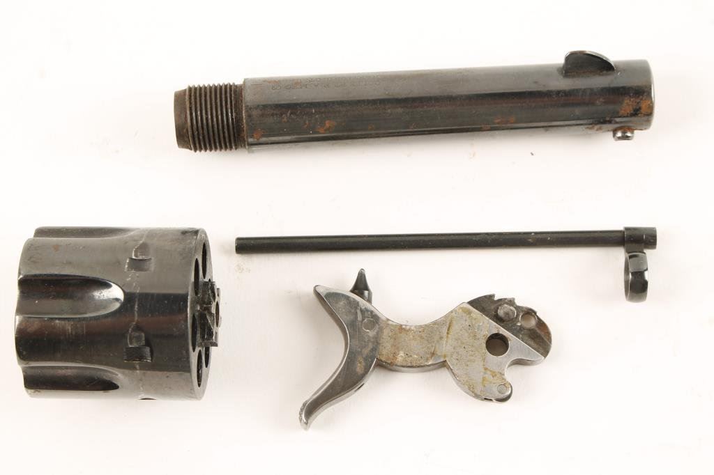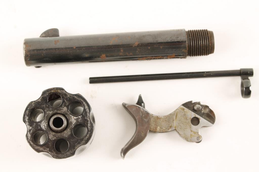 Single Action parts lot with .32-30 4 ¾” BBL and cylinder both re-blued in fair condition and well marked. Along with a 2nd generation hammer and a replacement ejector rod with black powder style donut head. Est.: $150-$300
