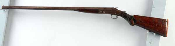 Description S: Walnut. Early black powder shell with an old tape repaired wrist. Condition (Fair).