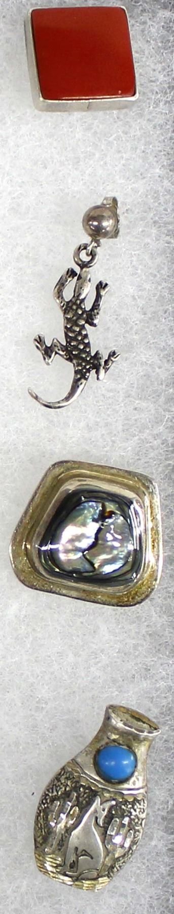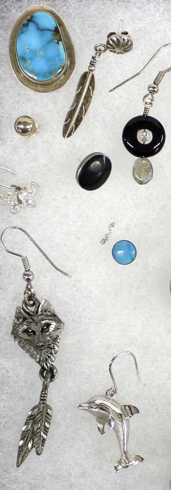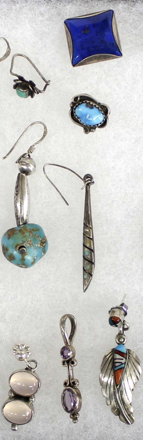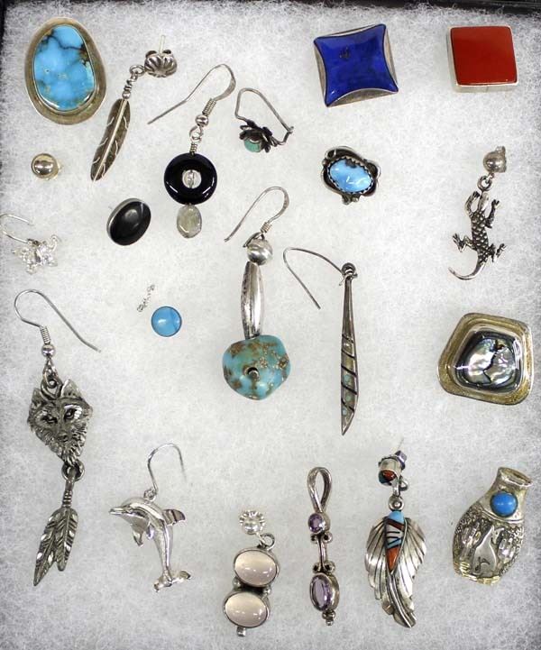 Collection of Single Earrings, Some Native American (Zuni and Navajo, Most Sterling Silver, includes turquoise, abalone, coral, mother of pearl, moonstone, onyx