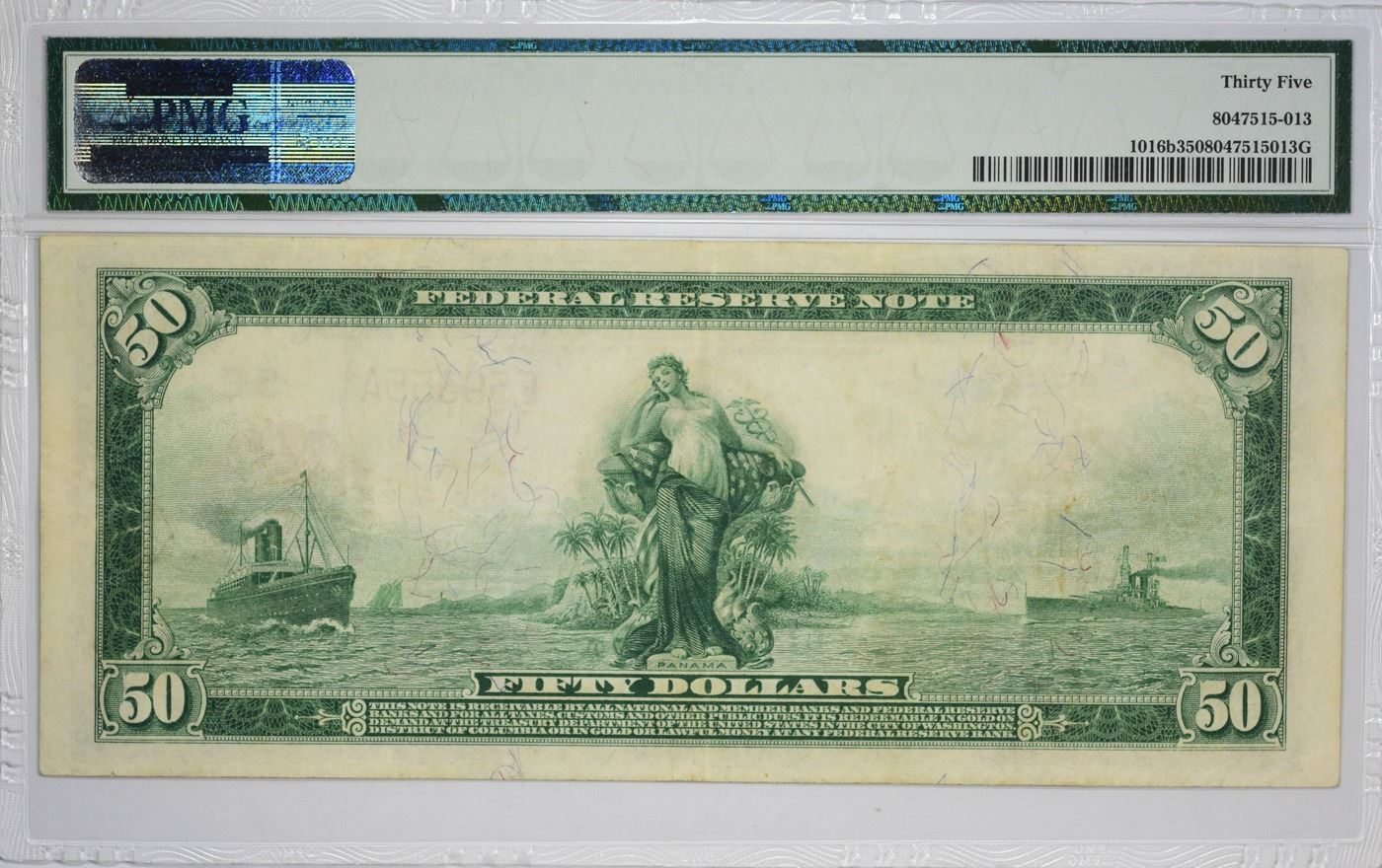 Single Finest PMG Graded Fr. 1016b Fr. 1016b. 1914 $50 Federal Reserve Note. Red Seal. Richmond. Choice Very Fine 35. With a population of just 22 pieces for this "b" type 50 and higher grade pieces unknown attractive mid-grade examples such as this offering are all that collectors can place in their holdings. This note is the finest PMG has certified for the catalog number by a nice margin with the next best being a pair at the Very Fine 25 level. Even circulation is seen here and this near Extremely Fine note is the highest grade piece to be publicly offered per Track & Price auction data.