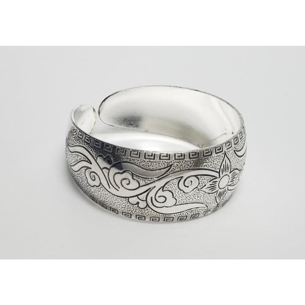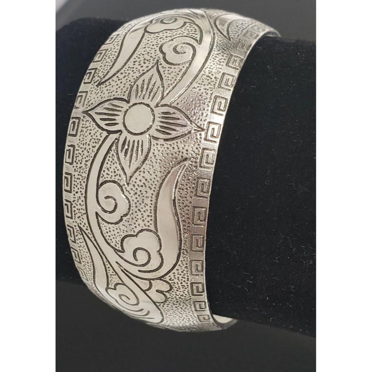 Single Flower Design Silver Toned Bangle Cuff. Looking For A Beautiful Floral Cuff Bangle? This Is The One For You. This Piece Screams Personality. If You Are Ready To Make A Statement At Outings And Catch The Eyes Of People, This Bangle Is Guaranteed To Do The Job. Add This Beautiful Flower Design Cuff Bangle To Your Collection Or Gift It To Someone You Love, Either Way This Piece Will Stay Bold. Please View Photos For Further Details.Â