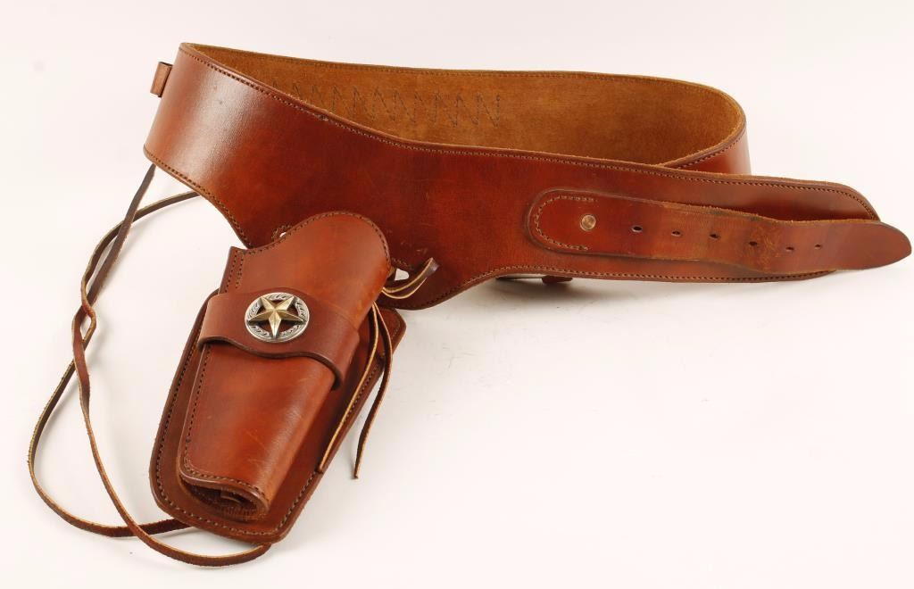 By Prescott, Arizona leathersmith. Features nice heavy stitched brown leather with single action holster and eighteen cartridge loops. Holster is embellished with a Texas star and belt size is approximately 40". Condition is excellent.