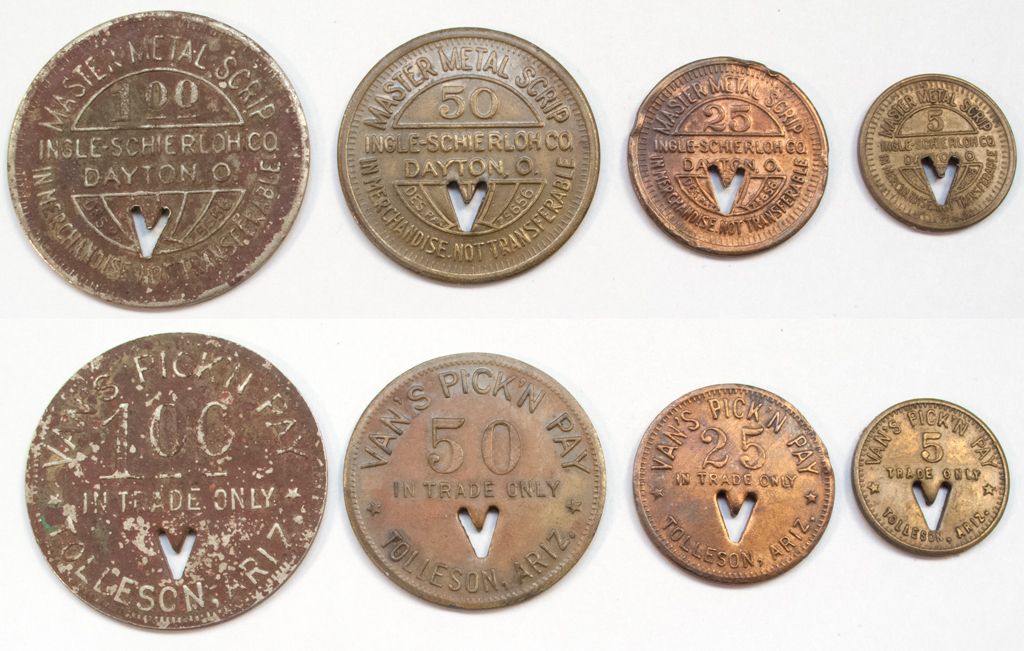 (4) VAN'S PICK'N PAY // 5 Brass & 25 Brass & 50 Brass & 1.00 WM all with V cutout as made.
