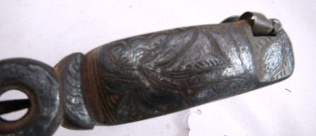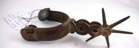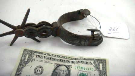Single Mexican Spur 4 inch rowels and heavy sterling inlay. $18.00 shipping. Rusty and used condition