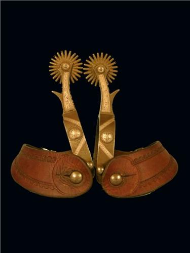 Single Mount Silver Overlay Spurs, unmarked with tooled leathers. Excellent condition.