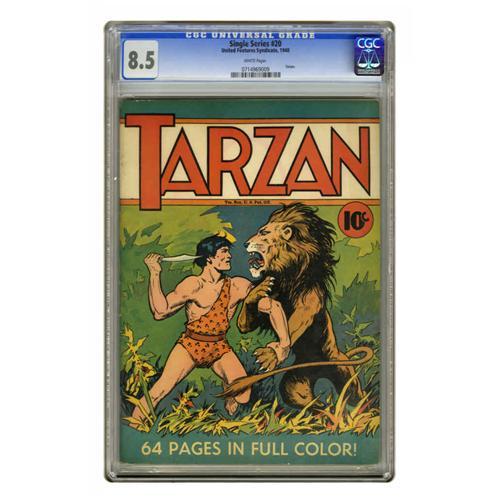 <B>Single Series #20 Tarzan (United Features Syndicate, 1940) CGC VF+ 8.5 White pages.</B></I> "The three most valuable comics (in the early days of comic collecting in the mid-1960s) were <B>Action Comics</B></I> #1... <B>Whiz</B></I> #1... and <B>Single Series</B></I> #20," wrote Mike Benton in <B>Comics Feature</B></I>, going on to note that all three books were worth a whopping $75 to $100 even way back then. While this issue no longer quite breathes the same rarified air as the other two keys, it's still one to go after as an early Tarzan book with Hal Foster art. No copy has been graded higher by CGC to date. Overstreet 2005 VF 8.0 value = $719; VF/NM 9.0 value = $1,110. CGC census 12/05: 3 in 8.5, none higher.