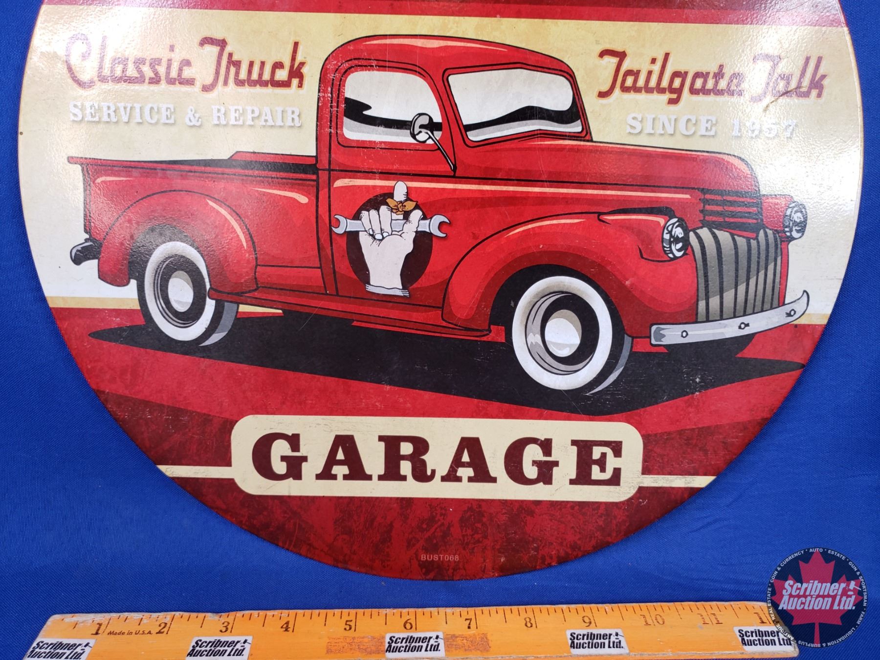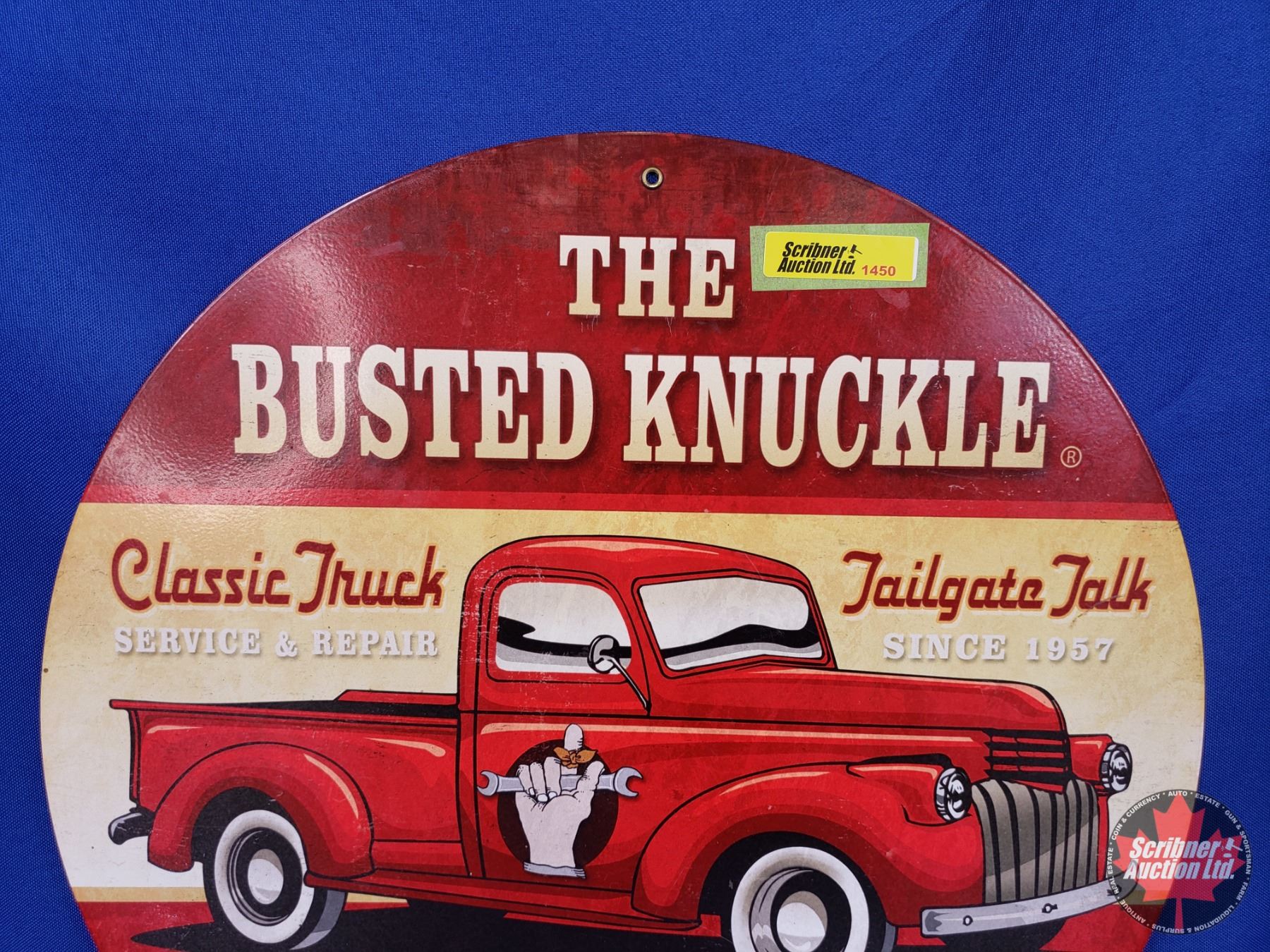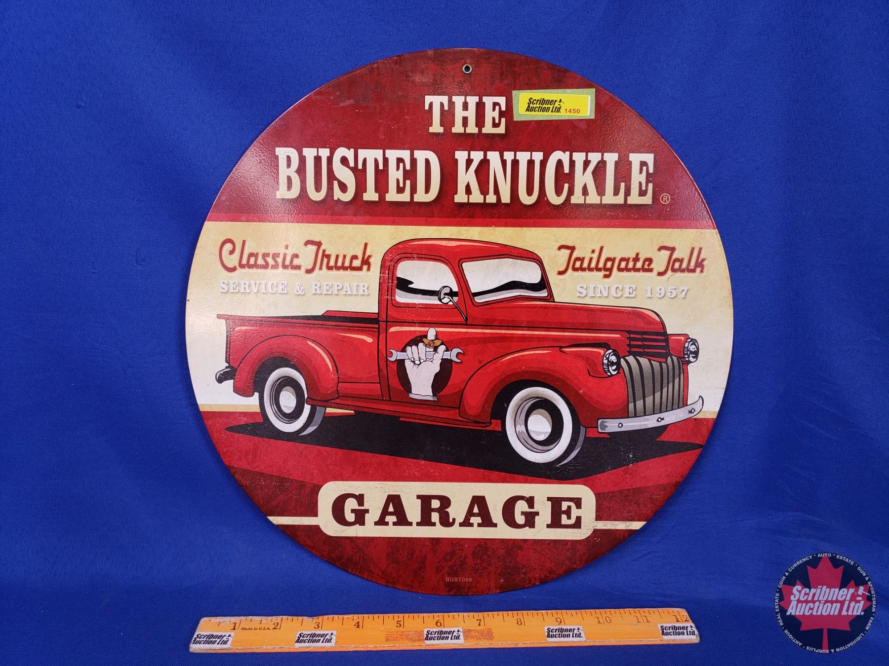 Single Side Tin Man Cave Sign - Round "Busted Knuckle Garage" (14"Dia) (SEE PICS!)