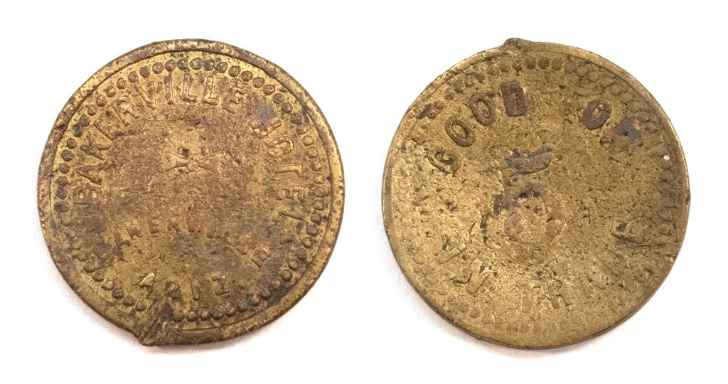 BAKERVILLE HOTEL // 5¢ Brass Town established by a Dutch Baker, Jake Perung, in 1880. This token was used from 1905-1907 and is the only known Token from this location.