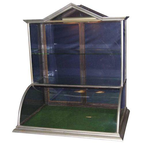 Single Tower Cathedral style Showcase, curved glass all nickel by Schmitt and Co. Cincinnati, OH. Two glass shelves, lighted. Product Not Included. Excellent condition. 36 X 41 X 27 inches.