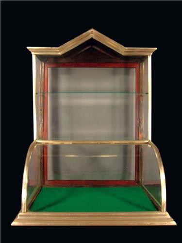 Single Tower Nickel Showcase, cathedral style. Excellent original condition. 28 X 37 X 22 1/2 inches.