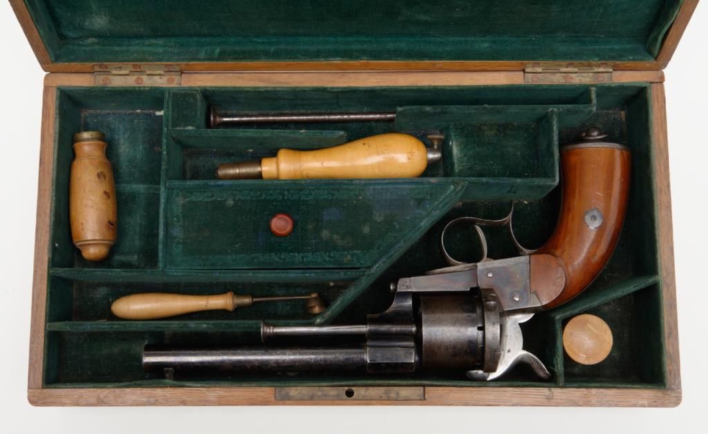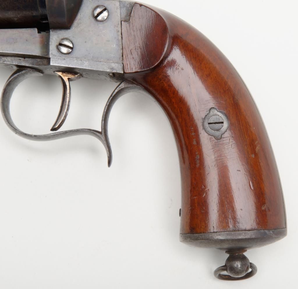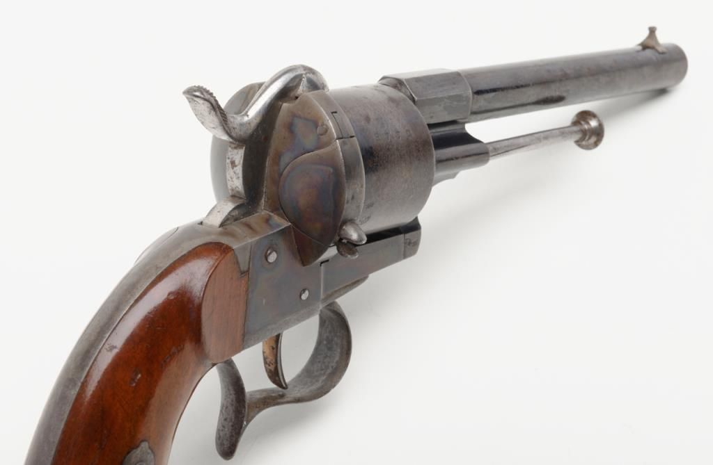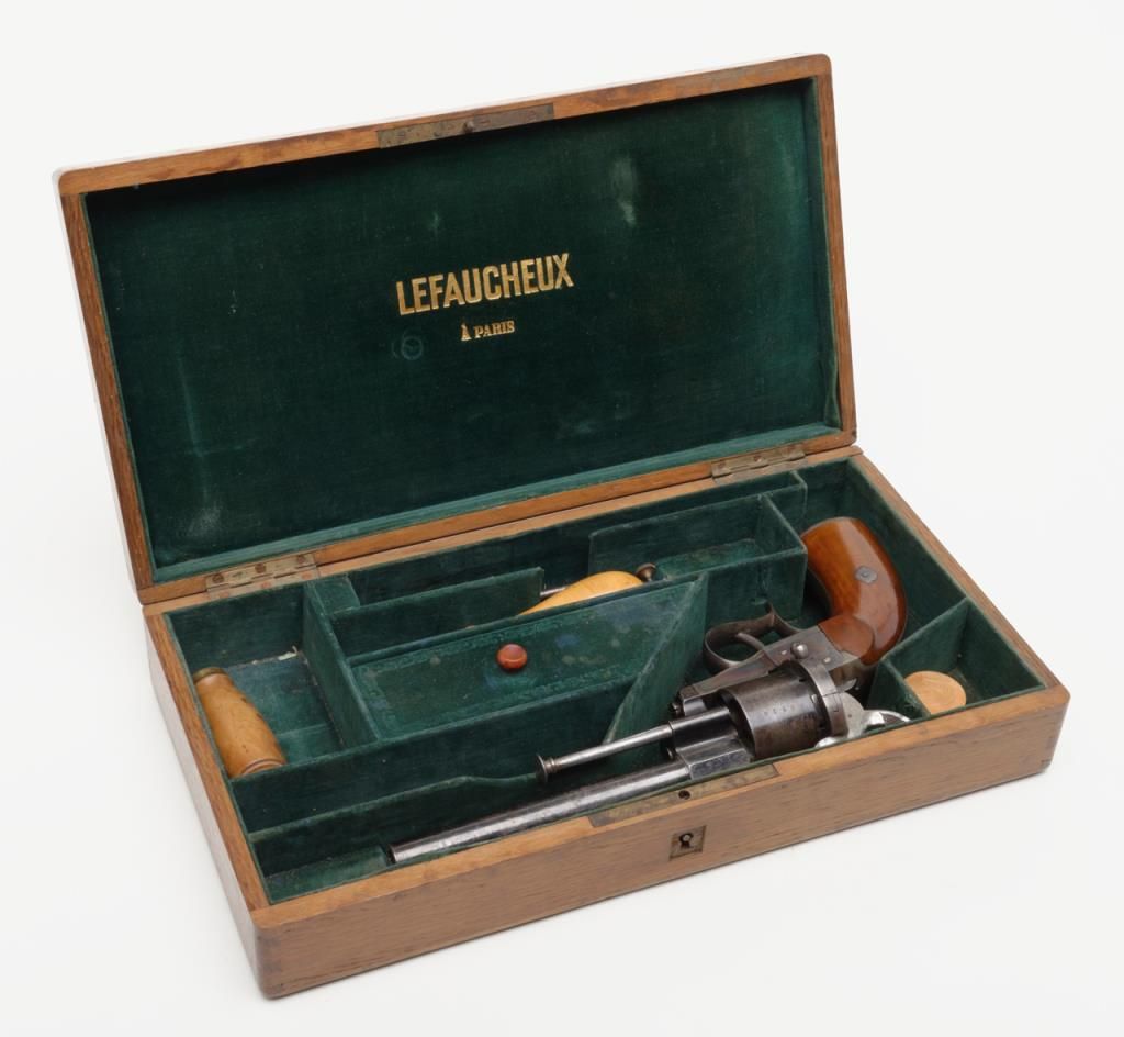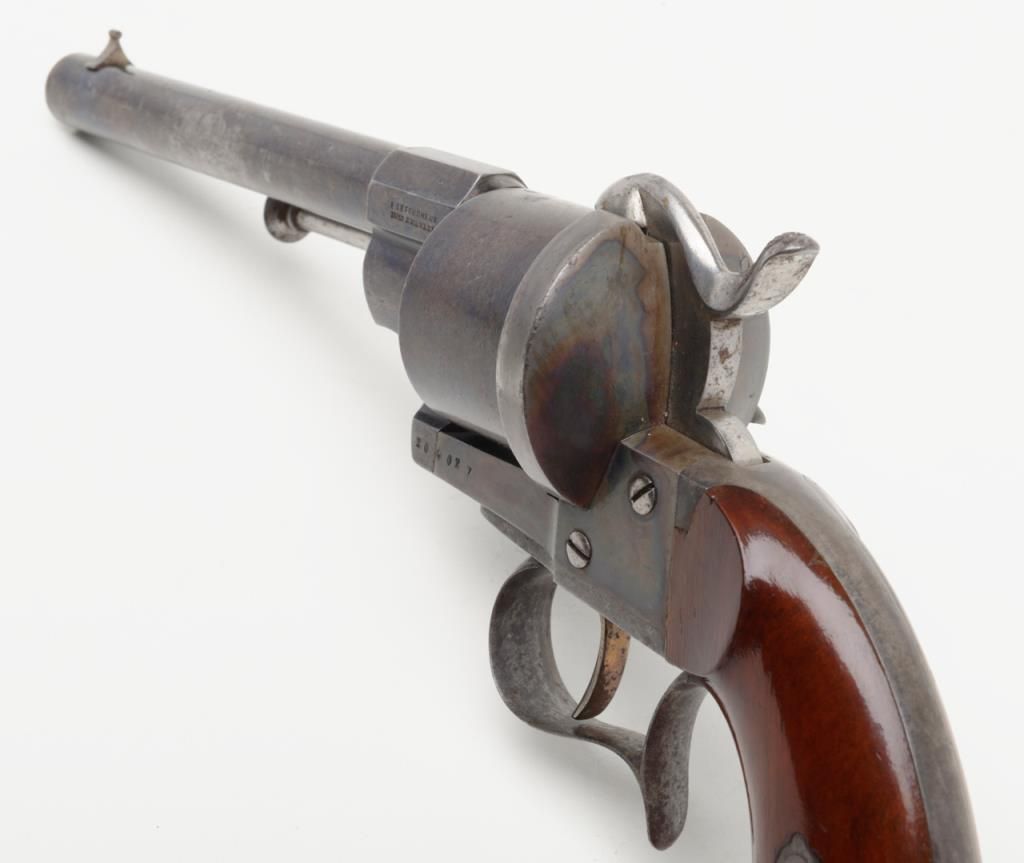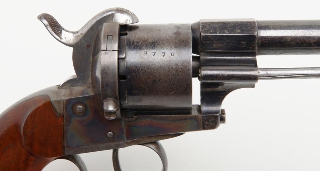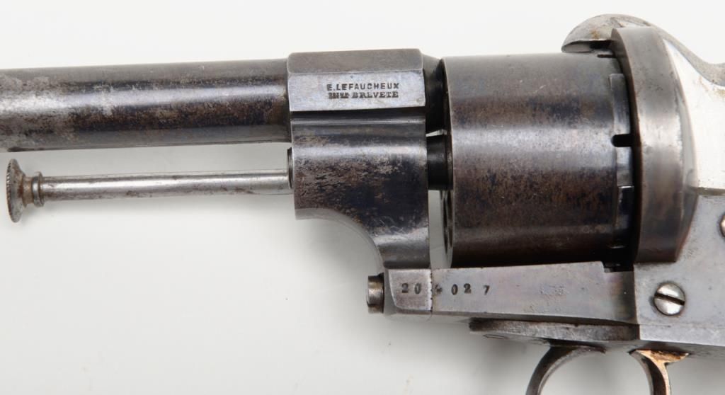 Single action pinfire revolver circa about 1859 by Lefaucheux of Paris in near fine original condition with blue and case hardened finish in its original to the period velveteen lined partition style case. The pistol measures 12 ¼”overall with a 6 ¼” barrel in military style with 11 mm bore. This pistol is serial numbered 204027 and may have been an officer’s private purchase. The barrel and cylinder show 40% to 60% original blue that is flaking and areas where the finishhas lifted are gone to a light patina with super crisp metal surfaces. The frame, trigger guard and mounts show 75% to 85% bright and colorful case hardening. The commercial quality varnished wood grips are also near fine with 80% to 90% originalvarnish showing just some minor storage scratches and handling marks. The interior shows very little to almost no use and the bore is bright. The case is lined in green velveteen with Lefaucheux A’ Paris embossed in the lid. The case contains apowder dipper, a rod and handles for tools which are missing their heads along with a small accessory box. The case retains its original compartment cover. The interior of the case is in very good plus to near fine condition and the