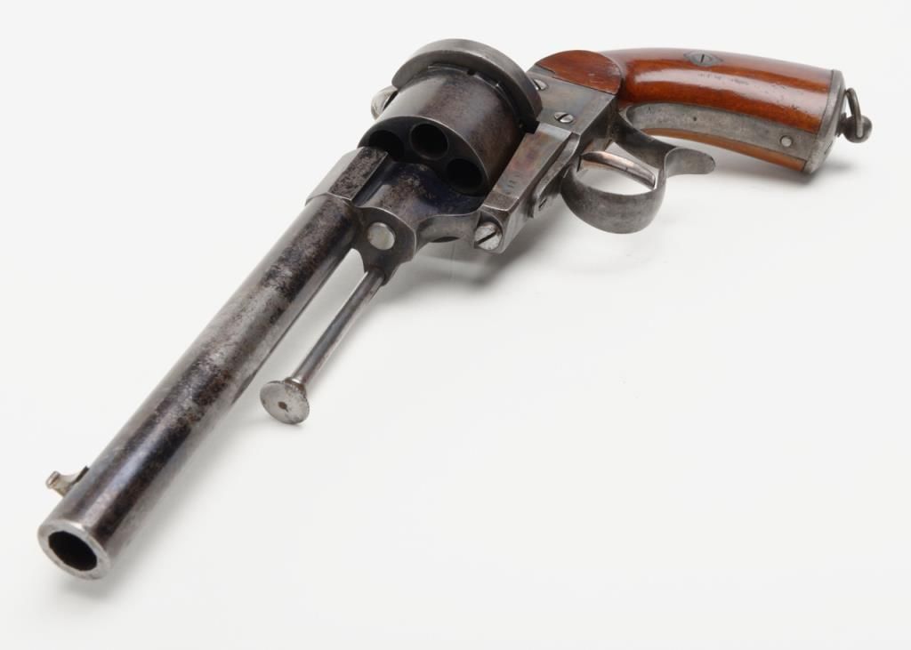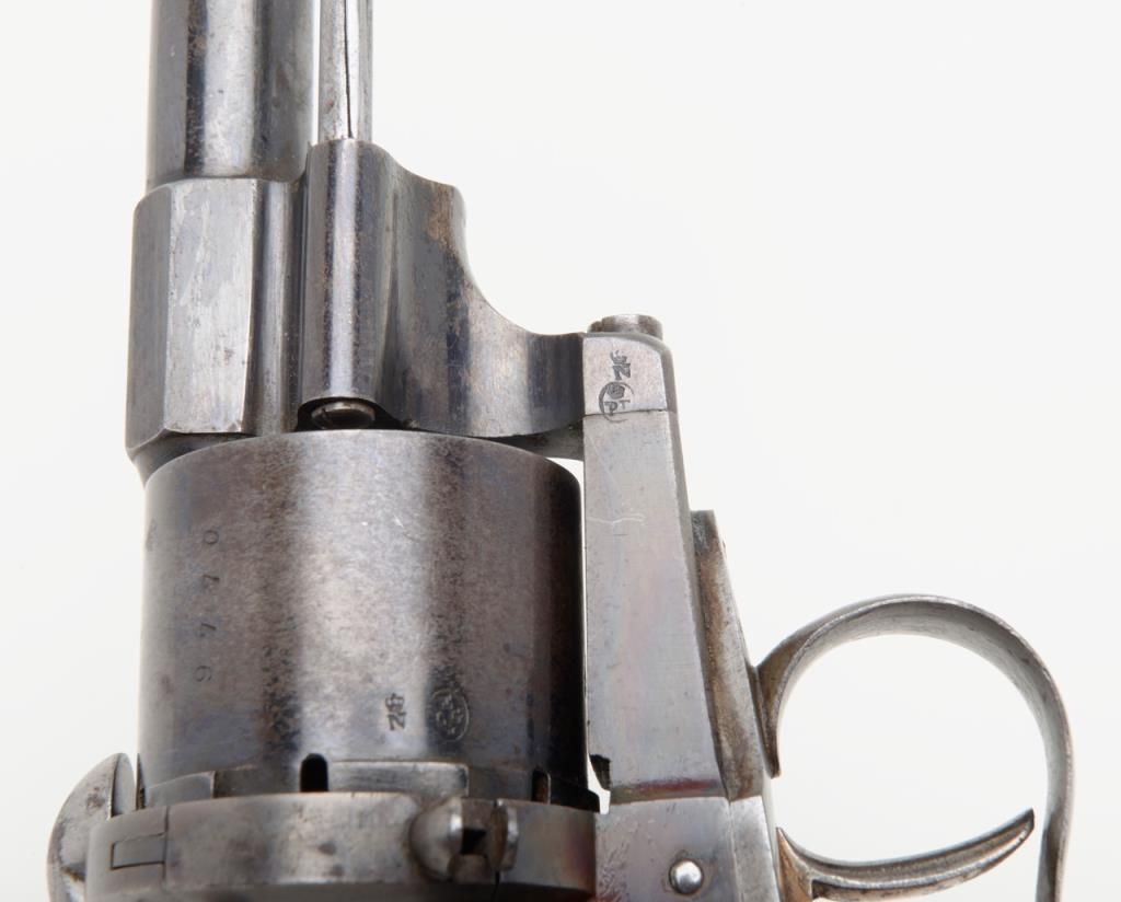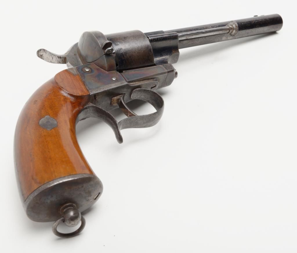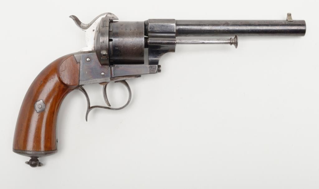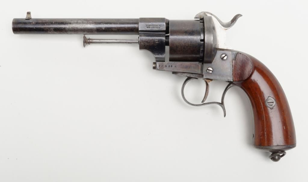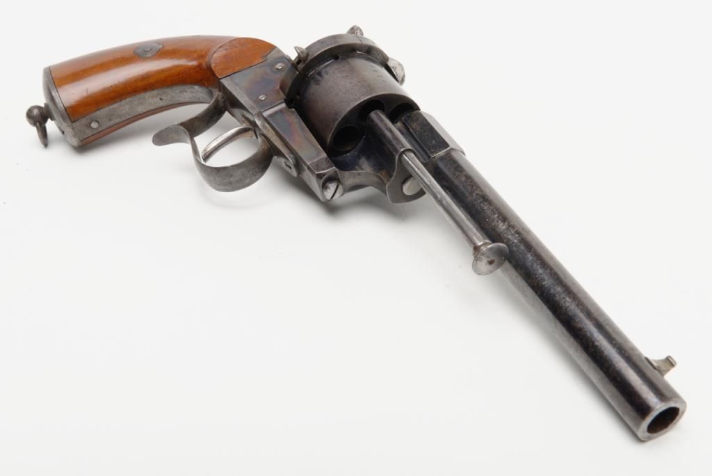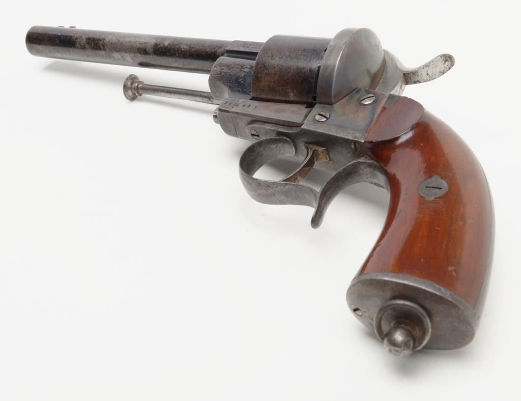 Single action pinfire revolver circa about 1859 by Lefaucheux of Paris in near fine original condition with blue and case hardened finish in its original to the period velveteen lined partition style case. The pistol measures 12 ¼”overall with a 6 ¼” barrel in military style with 11 mm bore. This pistol is serial numbered 204027 and may have been an officer’s private purchase. The barrel and cylinder show 40% to 60% original blue that is flaking and areas where the finishhas lifted are gone to a light patina with super crisp metal surfaces. The frame, trigger guard and mounts show 75% to 85% bright and colorful case hardening. The commercial quality varnished wood grips are also near fine with 80% to 90% originalvarnish showing just some minor storage scratches and handling marks. The interior shows very little to almost no use and the bore is bright. The case is lined in green velveteen with Lefaucheux A’ Paris embossed in the lid. The case contains apowder dipper, a rod and handles for tools which are missing their heads along with a small accessory box. The case retains its original compartment cover. The interior of the case is in very good plus to near fine condition and the