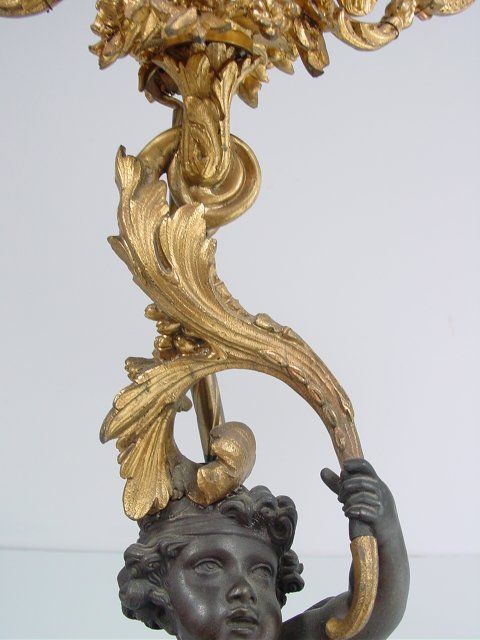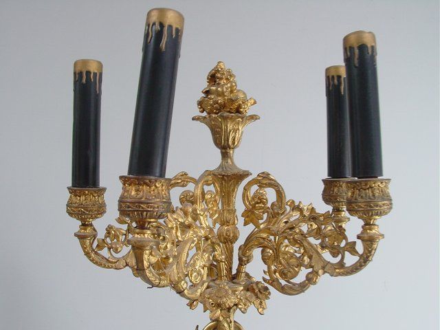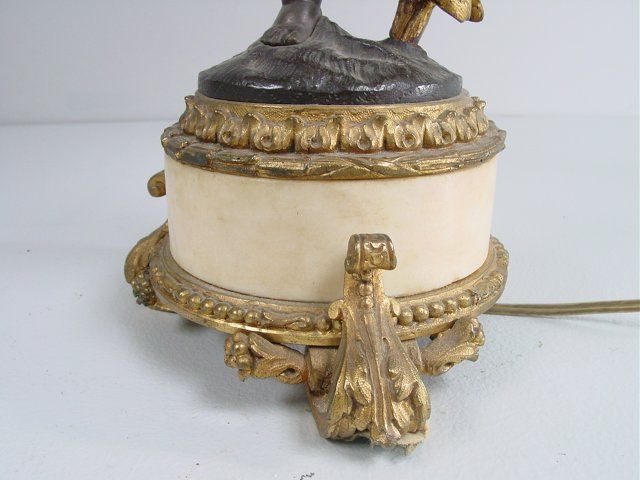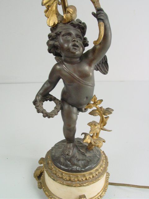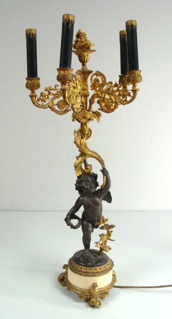 Cupids holding candlesticks on white marble & bronze base. Approx. 24" H x 11" W. From a Pelham NY estate. Please read our terms of sale.