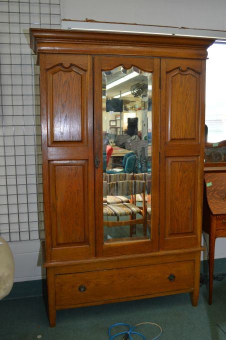 Single door oak wardrobe with raised panel side decorations, bevel glass mirror and drawer base