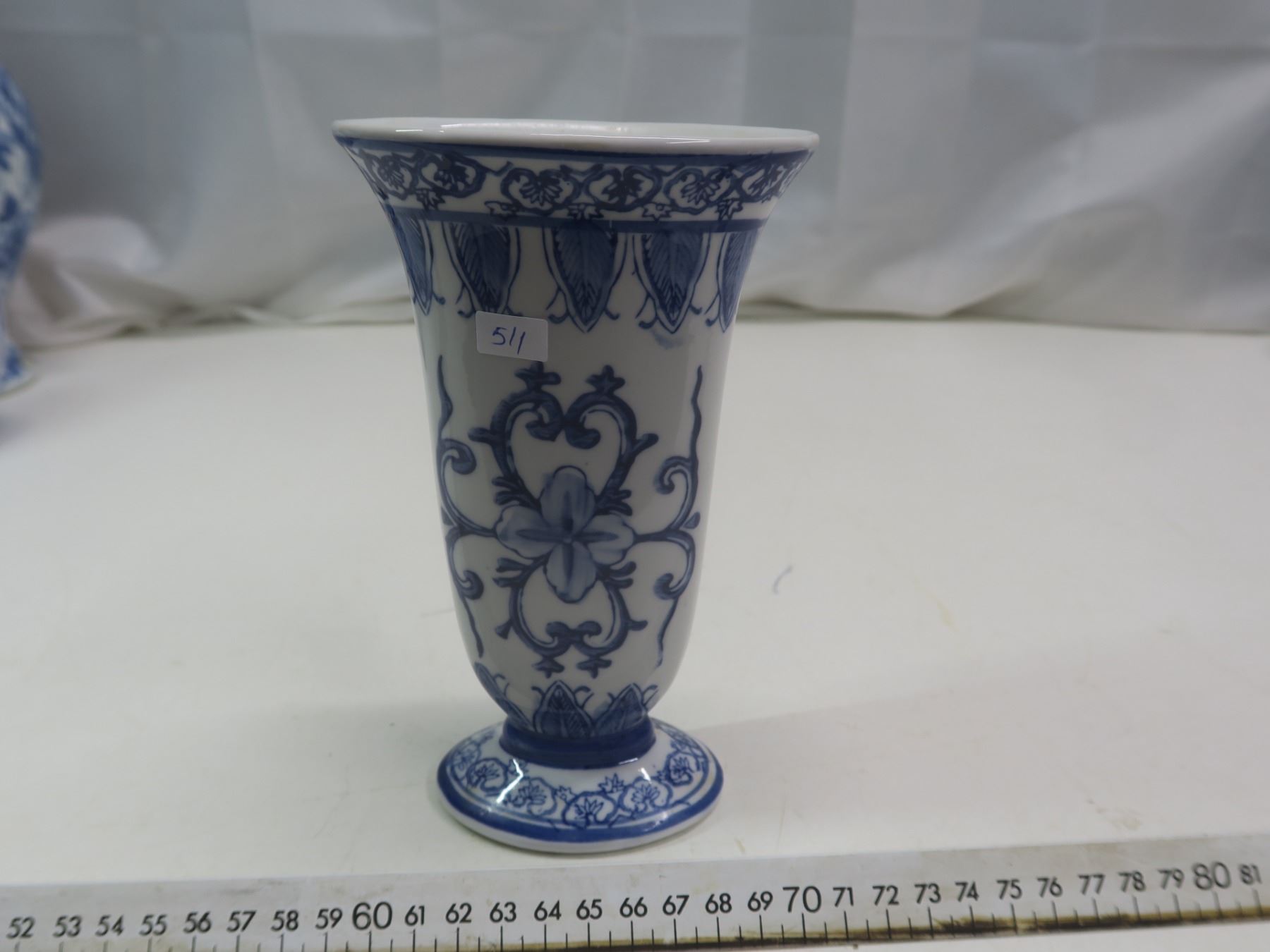Single fluted bud, vase in a floral and tabacco leaf pattern (7" tall)
