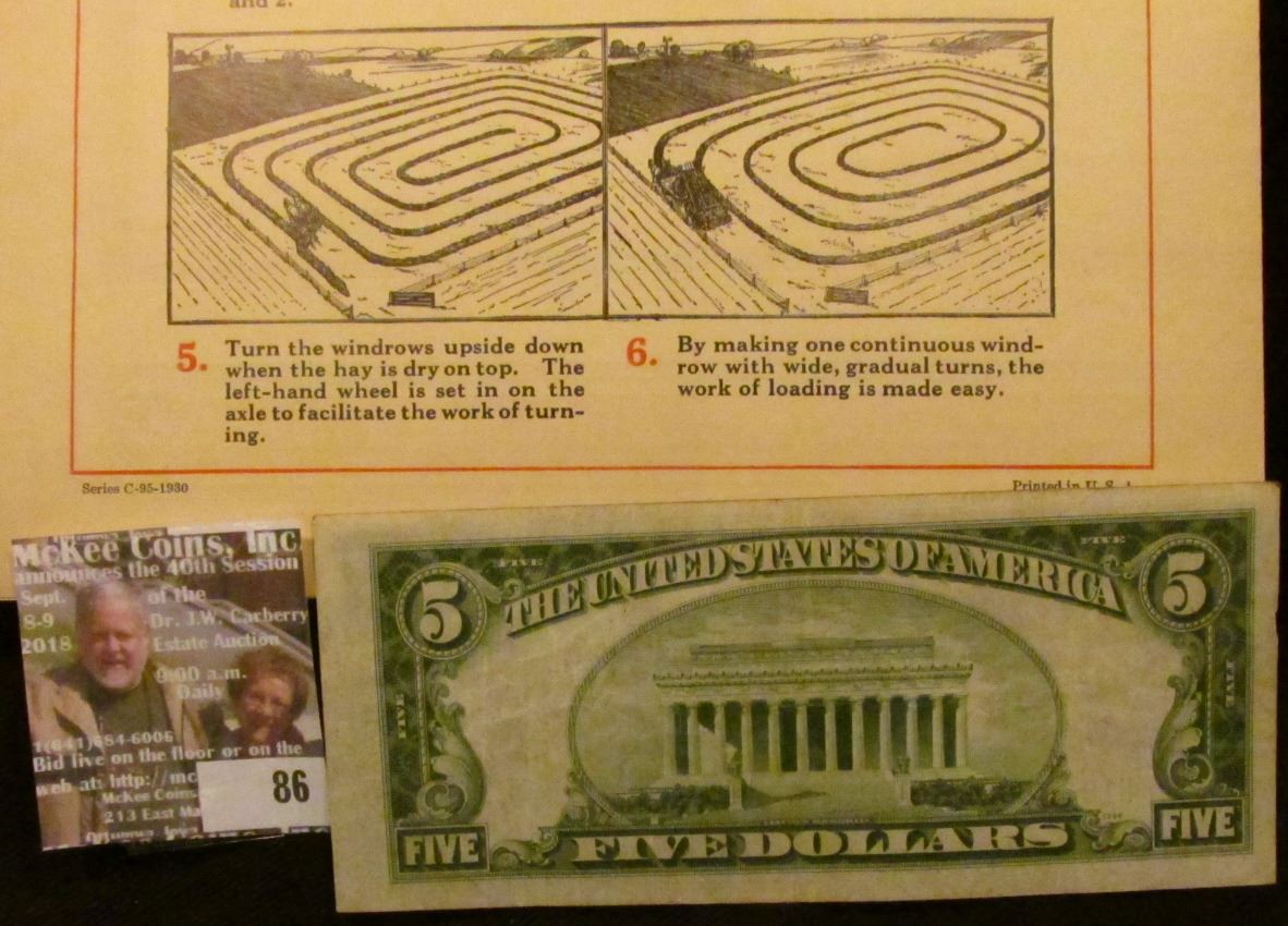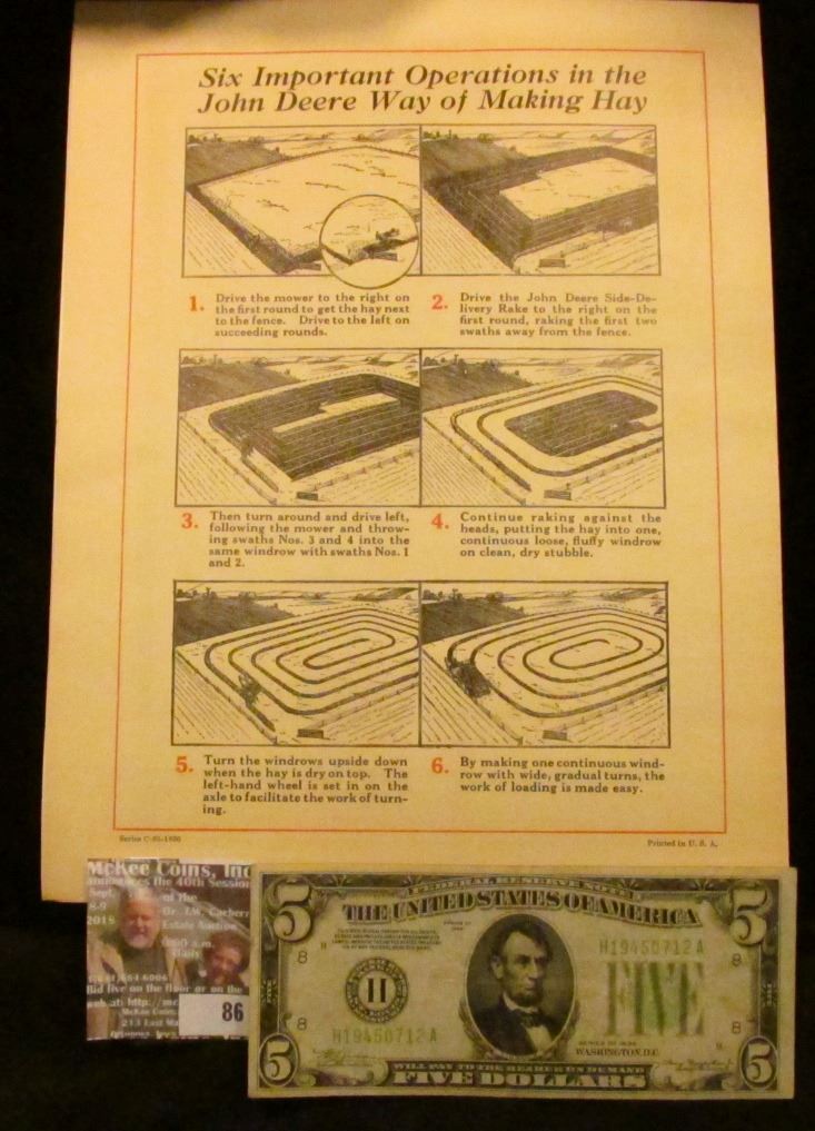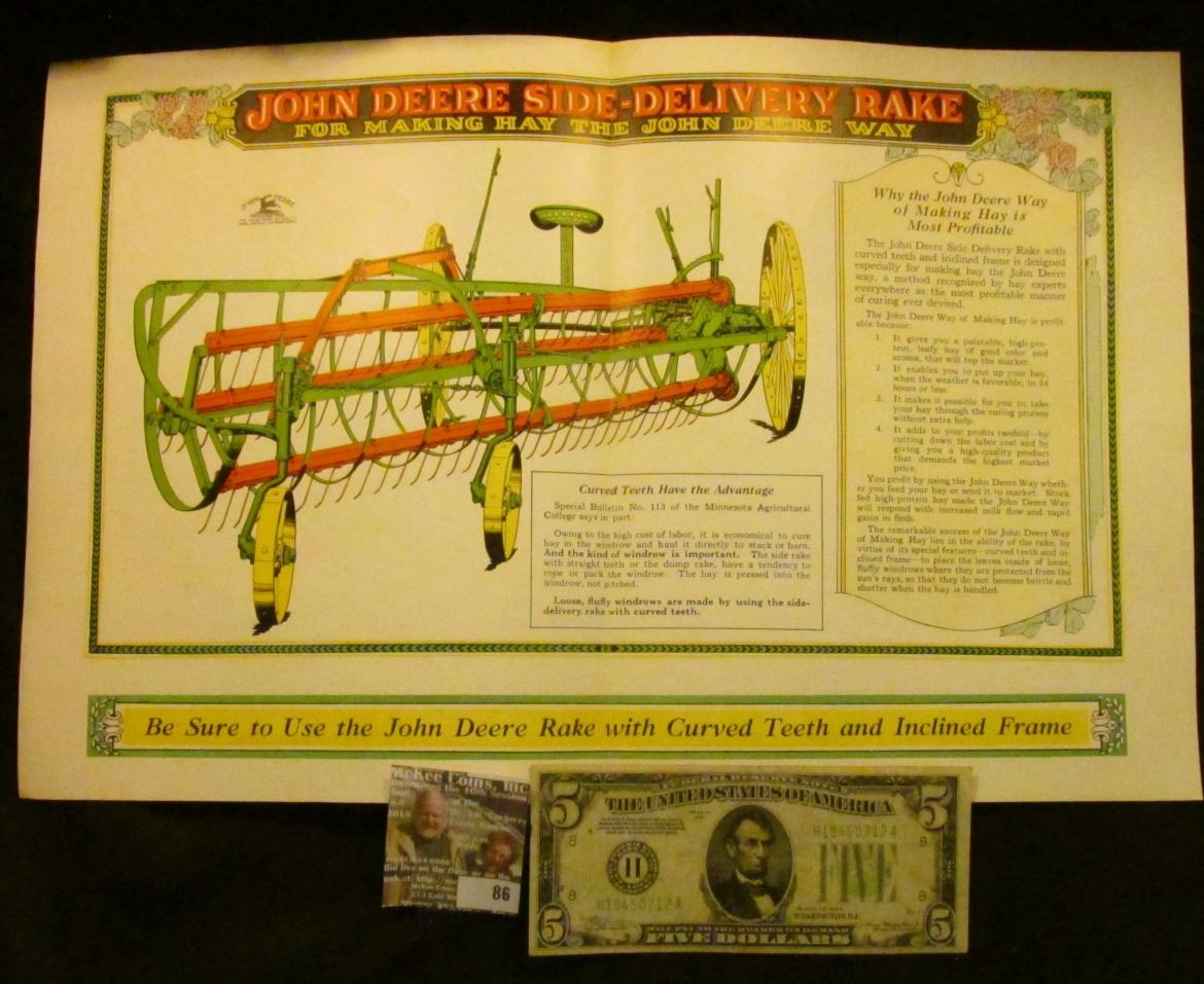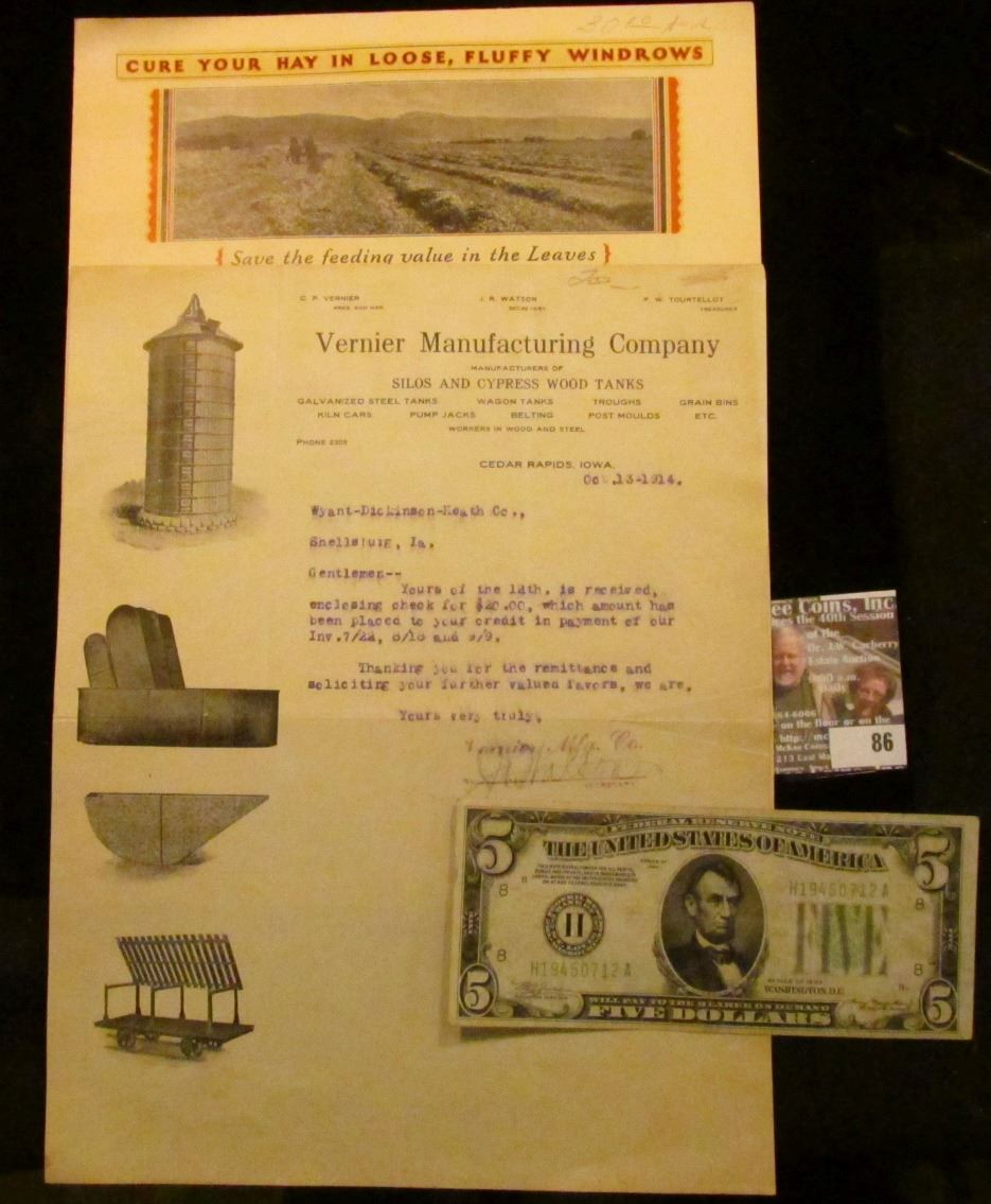 Single fold Advertising brochure "John Deere Side-Delivery Rake For Making Hay The John Deere Way"; 1914 Letter of letter head "Vernier Manufacturing Company Manufacturers of Silos and Cypress Wood Tanks…Cedar Rapids, Iowa…"; & Series 1934 $5 St. Louis, Missouri Federal Reserve Note, Fine, plate # H15/1396.