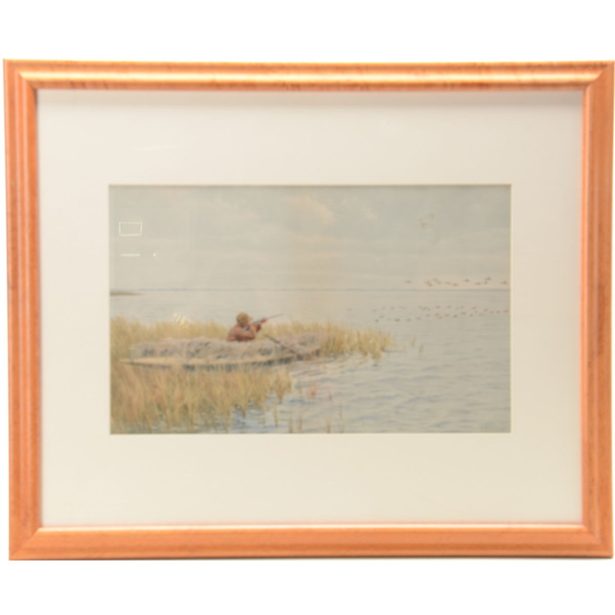 Single matted and beautifully framed color chromo litho by A. B Frost of a hunter shooting ducks from a blind, approx. 24” x 30” overall and approx. 12” x 19” image size in fine condition. Est.: $50-$100.