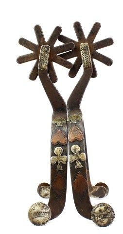 on inner heel bands in card suite patterns, heel bands 1/2" with 2 1/4" shanks, 2 point rowels. Est. 350-500