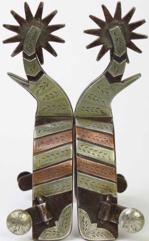Single mounted Emerson stamped spurs1 1/4" heel bands, 2 3/4" heel bands, 2" 12 point rowels with swinging buttons, nicely accomplished set with browned finish. Est. 250-450