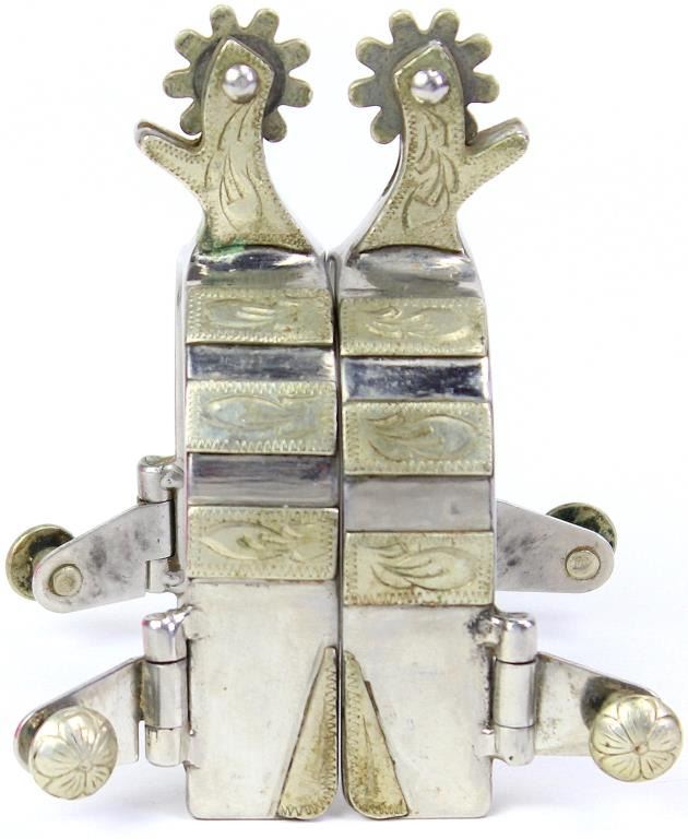 Single mounted pair short shank spurs unmarked, 1 1/2" shanks, 1" heel bands. unmarked, 1 1/2" shanks, 1" heel bands.