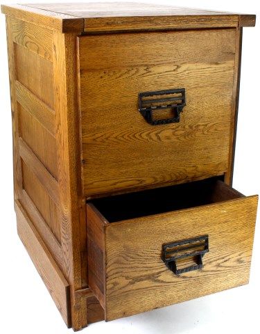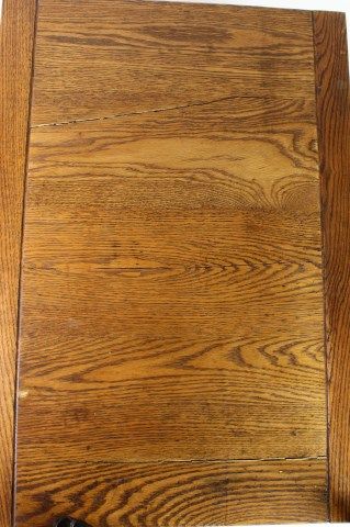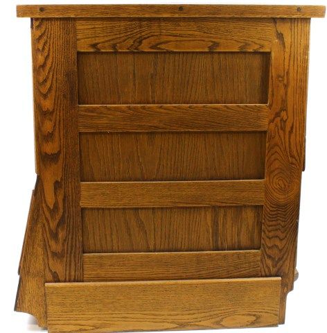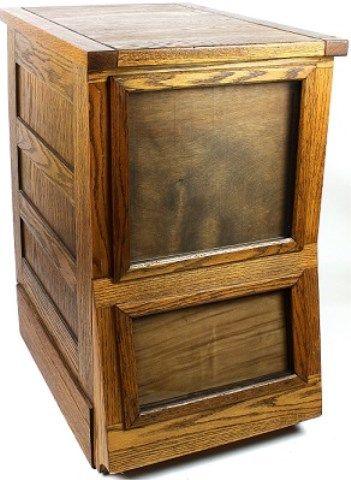 in oak, 33" tall X 28" deep X 20" wide, features glass front seed frames, 2 bulk drawer to back, nicely refinished. Est. 450-800