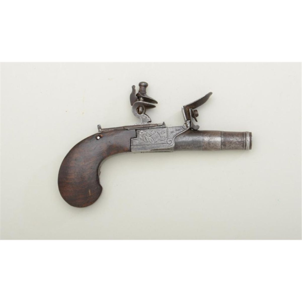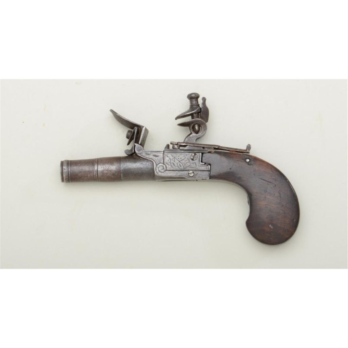 Single shot flintlock folding trigger derringer.45 cal., box lock, unmarked maker, 2’ cannon barrel, wood grips. This gun is in overall good condition with action needing work, metal surfaces display a brown patinawith some pin prick pitting at the muzzle. Est.: $300-$500.