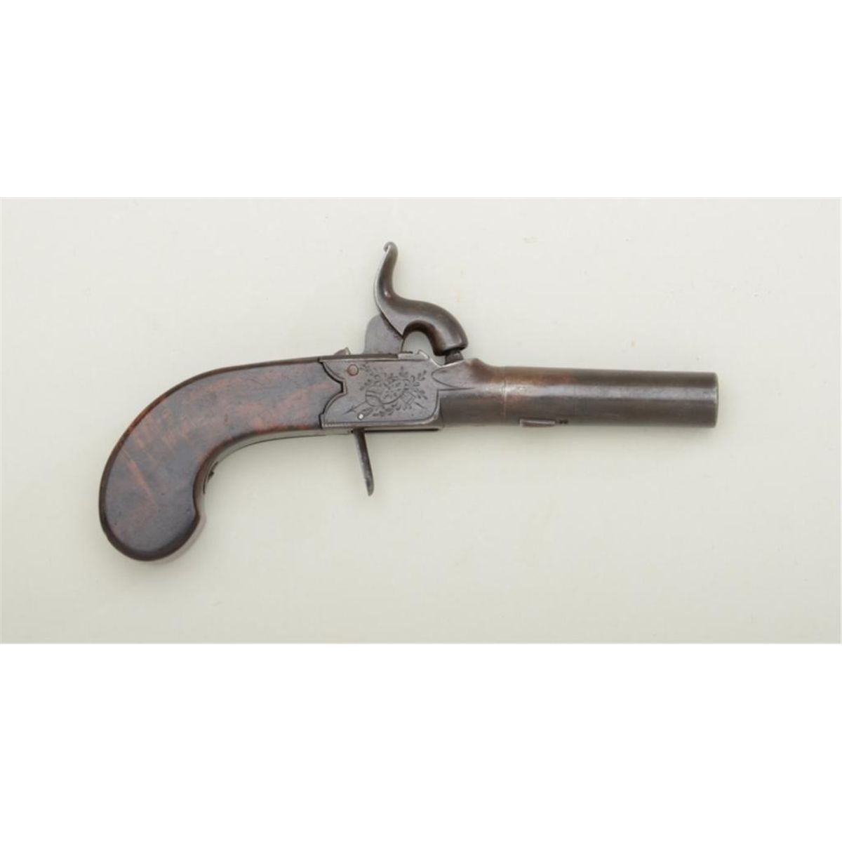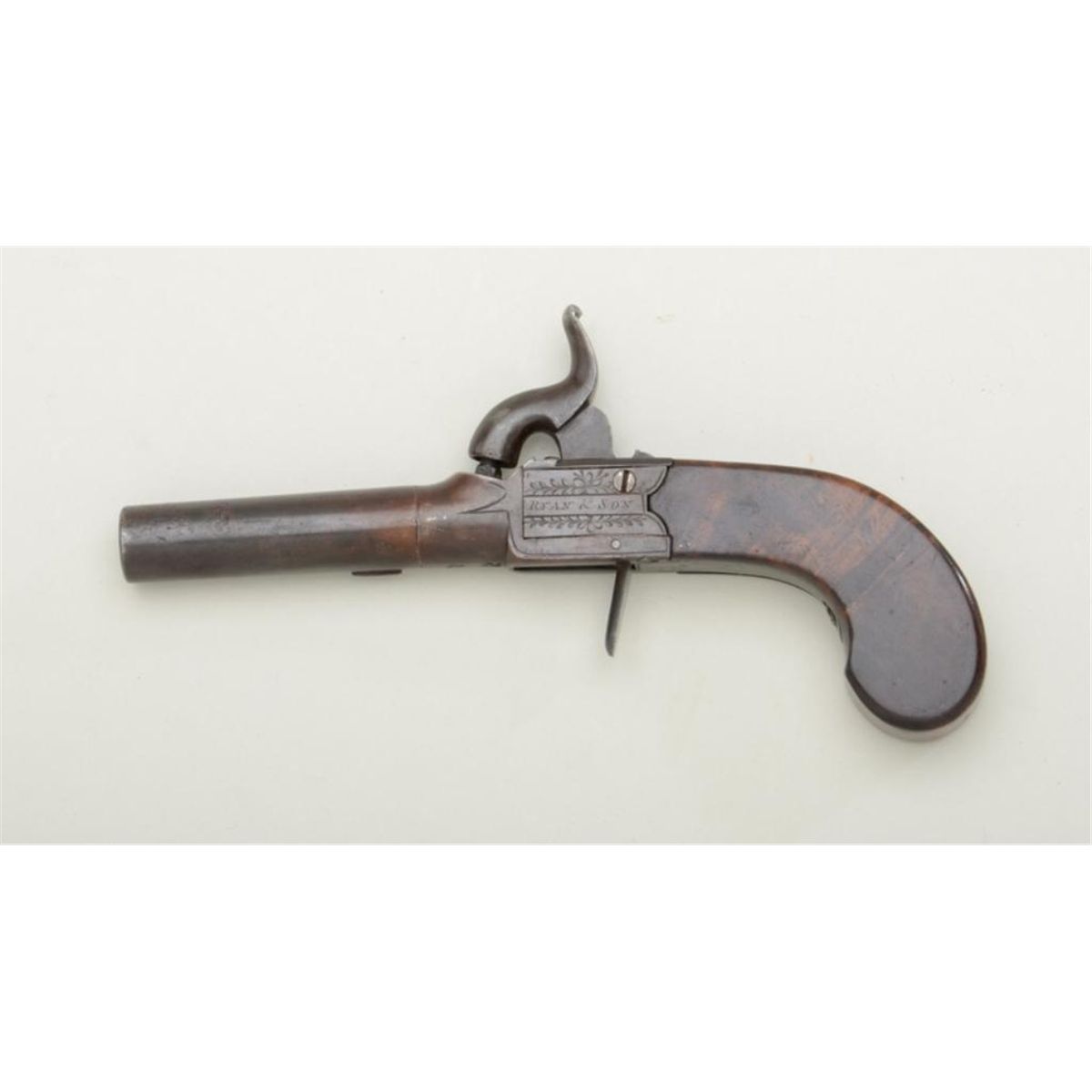 Single shot folding trigger, screw-off barrel center hammer percussion pocket pistol, .41 cal., 3” barrel, brown finish, maker Ryan & Son, wood grips. This gun is in overall very good condition with a brown patina on metalsurfaces and some pitting at the muzzle, dark bore, crisp action and markings; very good wood. Est.: $250-$400.