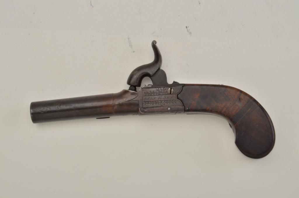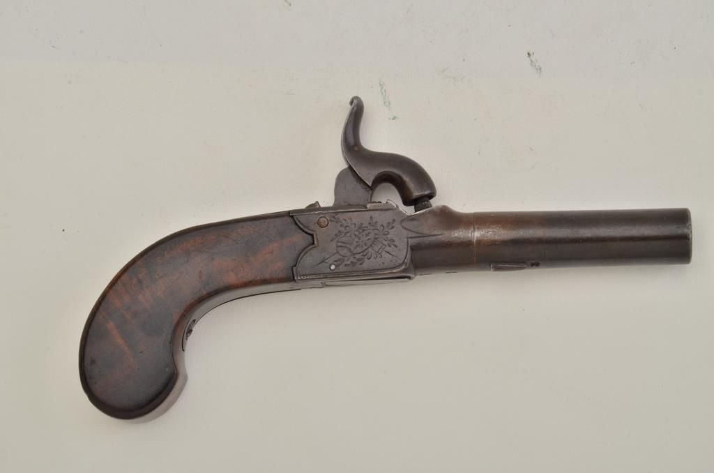 Single shot folding trigger, screw-off barrel center hammer percussion pocket pistol, .41 cal., 3” barrel, brown finish, maker Ryan & Son, wood grips. This gun is in overall very good condition with a brown patina on metalsurfaces and some pitting at the muzzle, dark bore, crisp action and markings; very good wood. Est.: $250-$400.